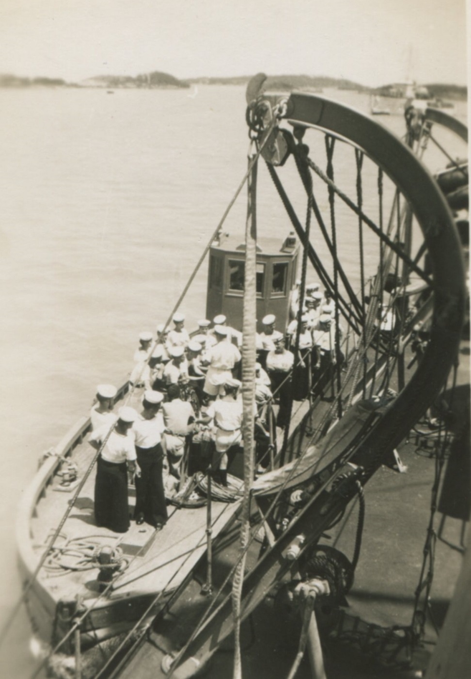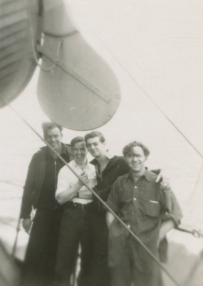 (GS38) Gilbert Smith (2nd from right) and shipmates by the ship's sea boat on HMCS FRONTENAC K335 (GS39) Gilbert Smith by the ship's sea boat on HMCS FRONTENAC K335 (GS40) After signal lamp / searchlight tower and after gun tub on HMCS FRONTENAC K335 (GS41) Gilbert Smith (2nd from left) and shipmates on HMCS FRONTENAC K335 (GS42) Gilbert Smith on the 21-inch signal lamp on HMCS FRONTENAC K335