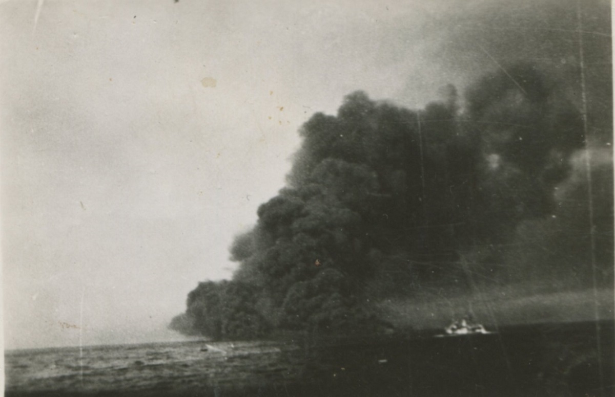 (GS58) Unknown torpedoed merchant ship - convoy escort to right of ship searching for / picking up survivors (GS59) Gilbert Smith (left) and shipmate ashore (GS60) Unidentified FRONTENAC sailors ashore (GS61) Unidentified FRONTENAC sailors ashore (GS62) Unidentified FRONTENAC sailors ashore