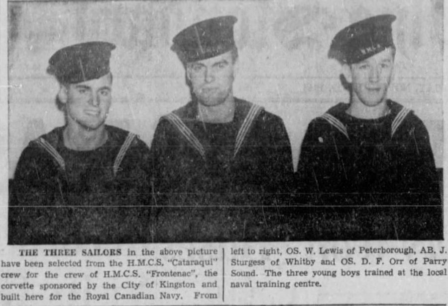 (FNC006) The Three Sailors in the above picture have been selected from the H.M.C.S. "Cataraqui" crew for the crew of HMCS "Frontenac", the corvette sponsored by the City of Kingston and built here for the Royal Canadian Navy. From left to right, OS W. Lewis of Peterborough, AB. J. Sturgess of Whitby and OS D. F. Orr of Parry Sound. The three young boys trained at the local naval training centre. // the Kingston Whig-Standard, Friday, 19 Nov 1943 // Courtesy of James Sturgess (FNC007) Article on HMCS FRONTENAC'S wartime service // The Kingston Whig-Standard 13 Oct 1945 // Courtesy of James Sturgess