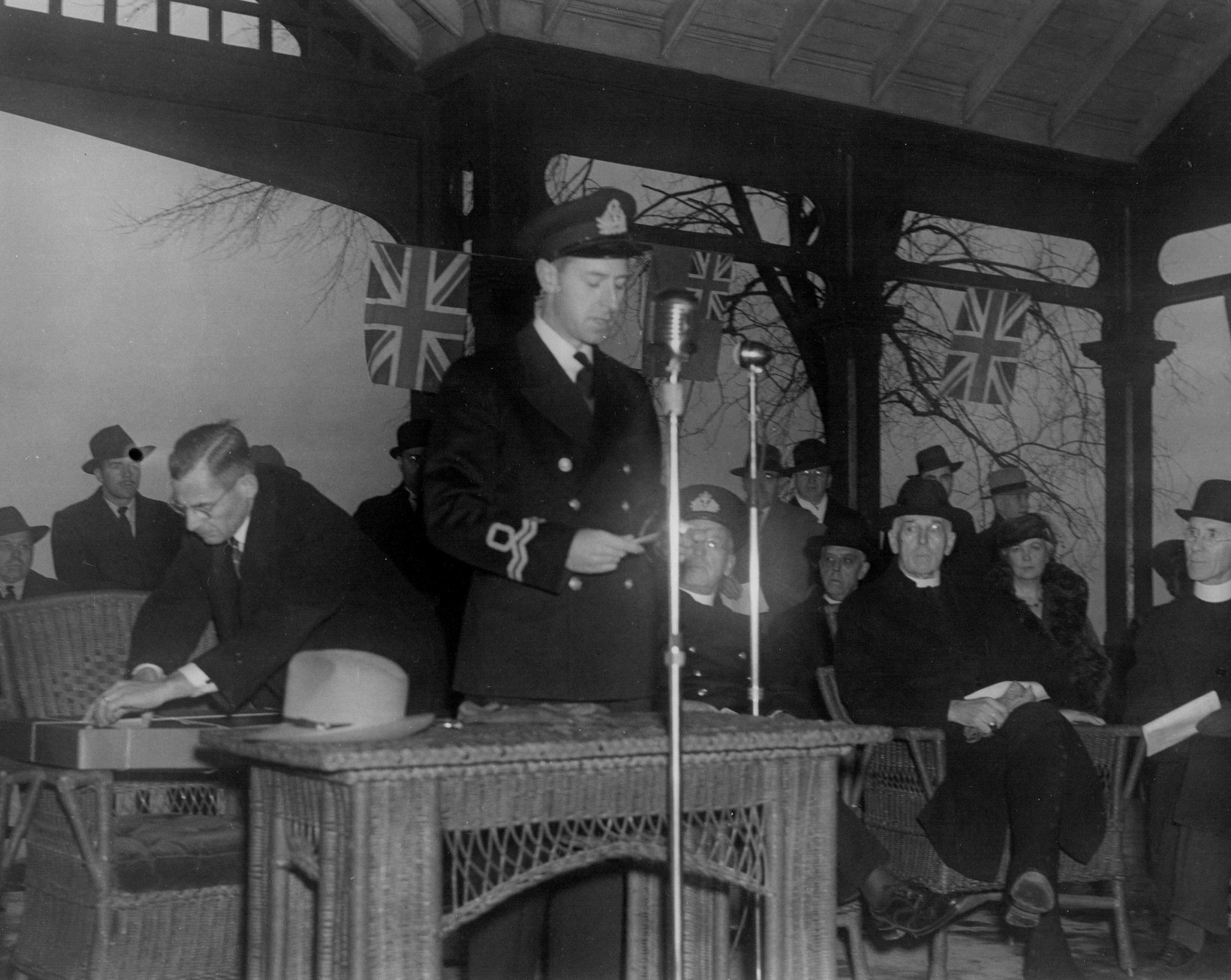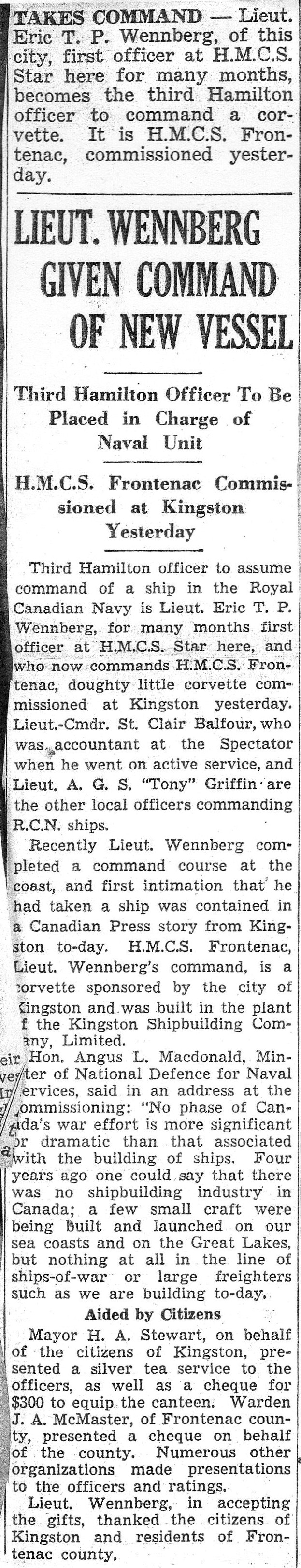(ETPW017) Lt Erik Wennberg given command of new vessel - HMCS FRONTENAC K335 (ETPW018) Lt Erik Wennberg addressing Kinston city sponsors for HMCS FRONTENAC K335, the ship he would command (ETPW019) HMCS FRONTENAC K335 (ETPW020) HMCS FRONTENAC K335 From the collection of LCdr Erik Wennberg, RCNVR / RCN(R) Courtesy of Mike Menzies