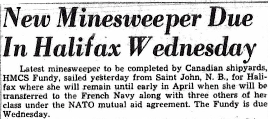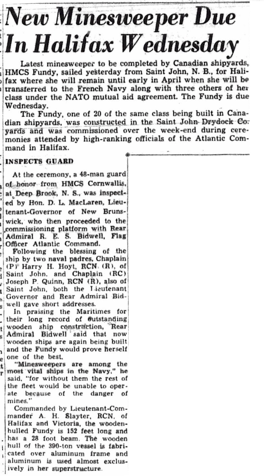 Article on the FUNDY'S arrival in Halifax The Halifax Chronicle Herald, Tuesday, 23 Mar 1954 Click on the above image to read the full article Researched by George Newbury