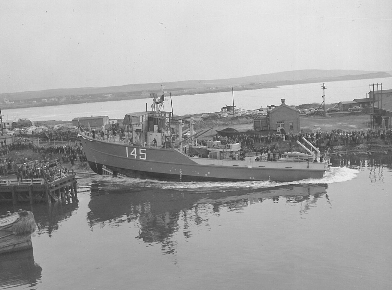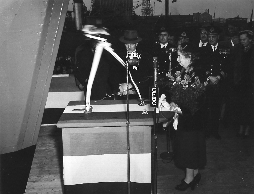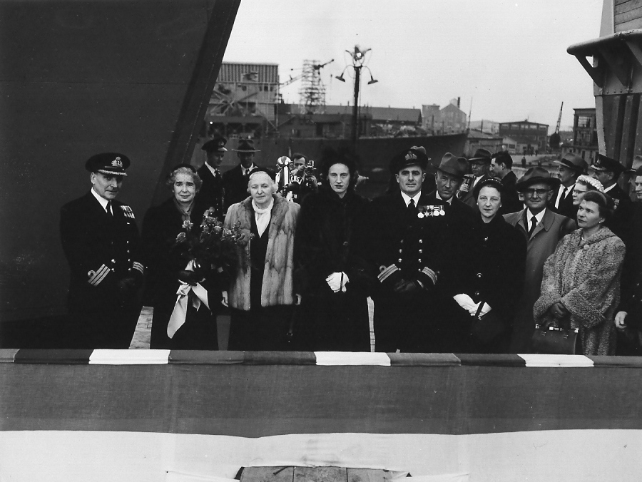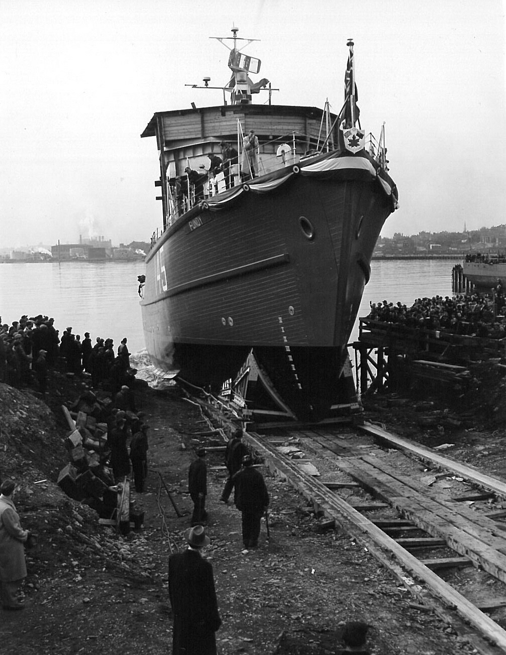 The launching ceremony of HMCS Fundy 145 - 09 Dec 1953 Photographer: Eugene Miller, RCN Courtesy of Rene Miller