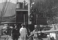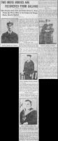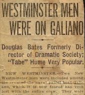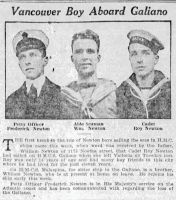 (GAL006) Officers of the GALIANO: Commander, Lieut. (Capt.) R.M. Pope, R.N.R. (in centre); Chief Engineer, I. Greenshields (right); Wireless Operator, Michael J. Neary (left). // Lieut. Pope, commander of the GALIANO, had commanded the GALIANO ever since she came to this country in 1913. He was born in England and came to this coast about 15 years ago. He had already served on sailing ships out of Great Britain to India, and was an officer aboard the steamers of the East India Company. He was also an officer in the Cape service from England to Africa. Later he served on a cruiser in the British Navy as a lieutenant. After he arrived here he made several voyages with the Empress of Japan as third officer. He then joined the Quadra and was with her under Capt. J.F. Walbran and Capt. C. Hackett. Lieut. Pope remained ashore some time and then took command of the GALIANO. Frank Greenshields, chief engineer, has been on the GALIANO ever since she arrived in Victoria. (GAL007) Article on GALIANO'S casualties // Courtesy of Operation Picture Me (GAL008) Article on Roy Newton and his two brothers who also served in the Navy during the Second World War // Courtesy of Operation Picture Me (GAL009) GALIANO's Crew: Names of the Lost // The Toronto Globe 05 Nov 1918