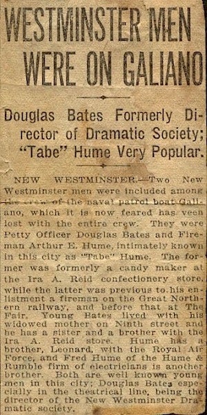 (GAL001) Five sailors on the HMCS GALIANO // Ref: ENMM No. VR992.84.14 // Source: Canadian Military History Volume 19 | Issue 1 Article (GAL002) SS GALIANO aground at Royal Roads Lagoon, ca. 1916. // B.C. Archives photo, call number B-03998. // Source: George Douglas Stanley Bate and the Lost Ship, the GALIANO // Courtesy of Gayle Jesperson (GAL003) Doug Bate and friend Arthur E. Hume on HMCS GALIANO // Source: George Douglas Stanley Bate and the Lost Ship, the GALIANO // Courtesy of Gayle Jesperson (GAL004) Newspaper article on Doug Bate and Arthur Hume // Source: George Douglas Stanley Bate and the Lost Ship, the GALIANO // Courtesy of Gayle Jesperson