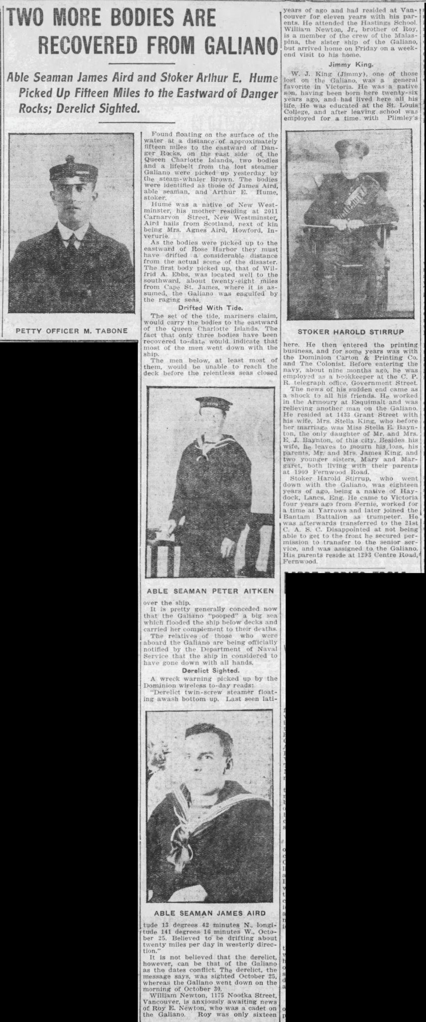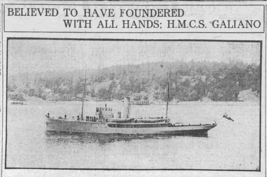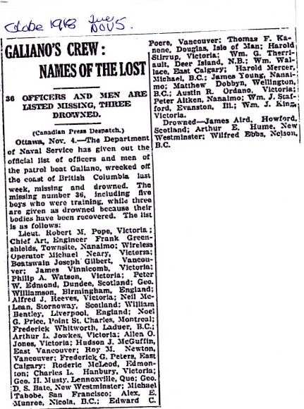 The Victoria Daily Colonists noted, on November 03, 1918: "The men of GALIANO died in the performance of duty. They have ventured into rough places and taken their chance many a time before. They did it without a flourish of trumpets. This time they took a chance and lost."