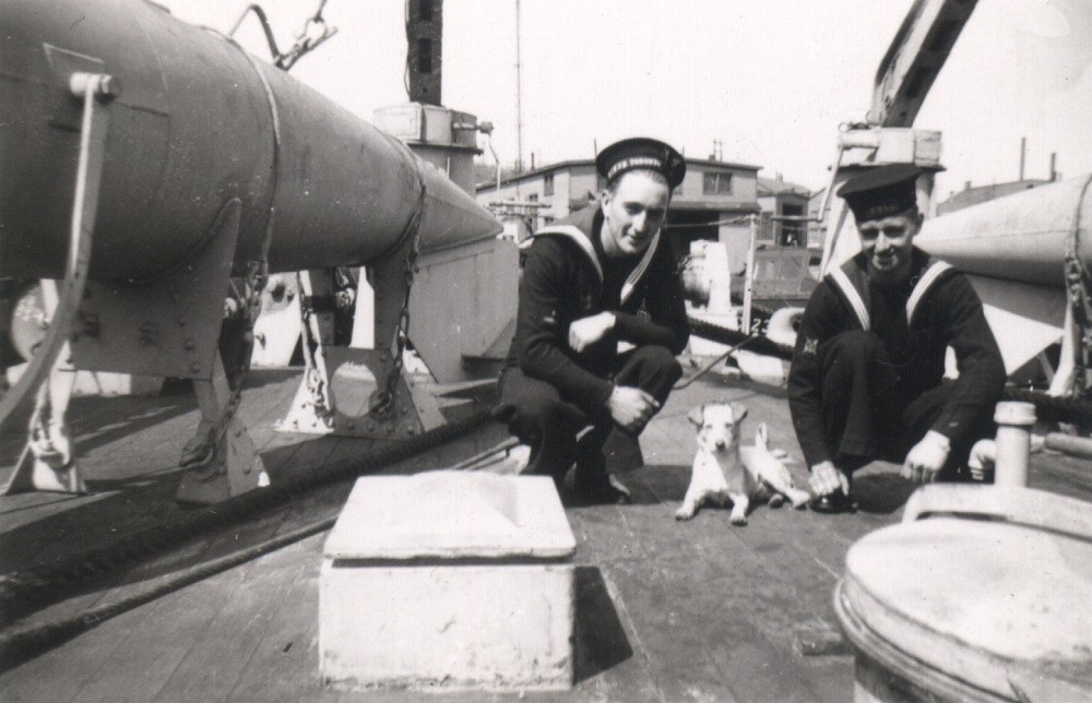 Two sailors and the ship's mascot on HMCS GANANOQUE
