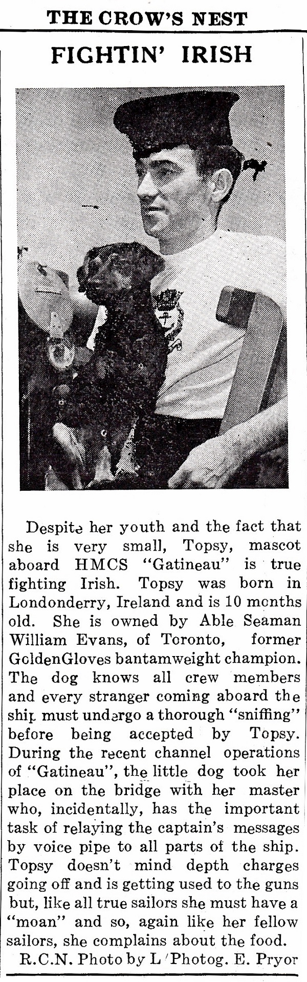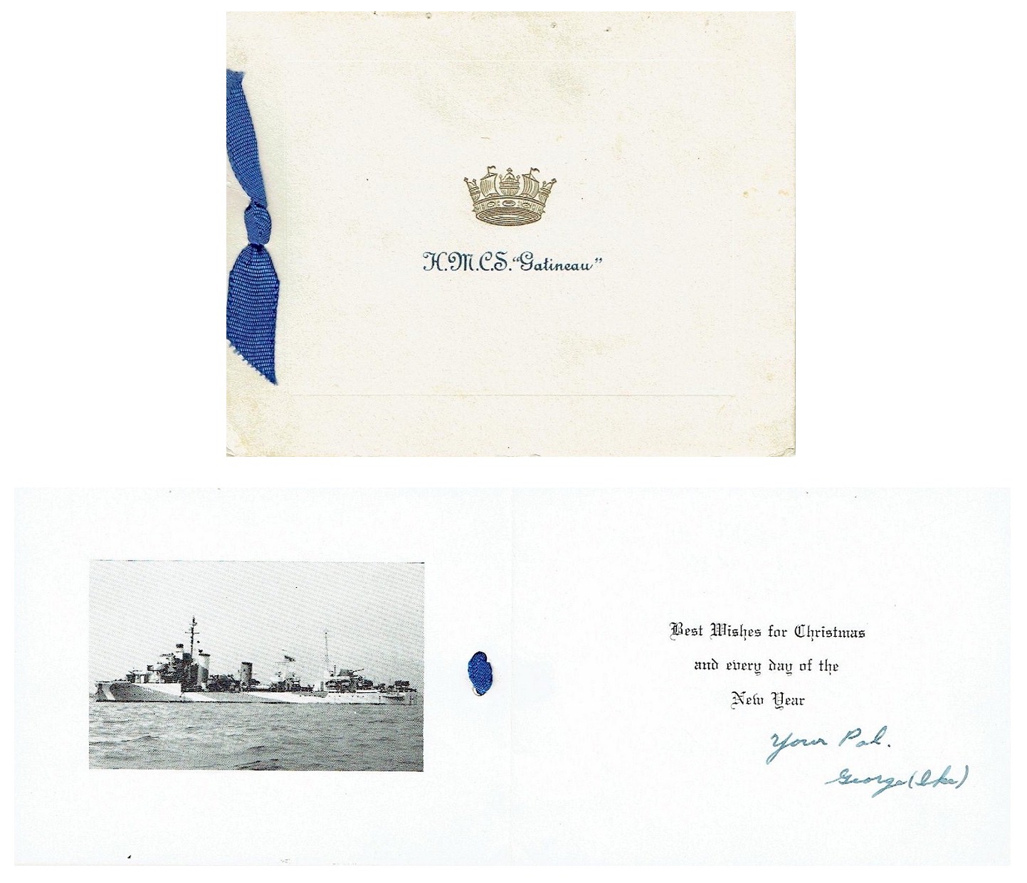 (GTN001)HMCS GATINEAU H61 // From the collection of Eric Baird // Courtesy of Roger Clarke (GTN002) HMCS GATINEAU H61 circa 1943-1944 // Photo taken from HMCS KAMLOOPS K176 // From the collection of Kenneth Medford, DSM // Courtesy of Gary Medford (GTN003) Canadian Naval Craft Sink German U-boat // The Halifax Chronicle 01 Jun 1944 // Researched by / Courtesy of George Newbury // Ships mentioned in the article: HMCS GATINEAU, HMCS CHAUDIERE, HMCS CHILLIWACK, HMCS FENNEL, HMCS ST CATHARINES, HMS ICARUS (GTN004) Newspaper article on HMCS GATINEAU's Mascot Topsy, and Topsy's owner, AB William Evans of Toronto, ON // Crow's Nest newspaper - Sep 1944 (GTN005) HMCS GATINEAU H61 Christmas Card // From the collection of George Howse // Courtesy of Dennis Carson