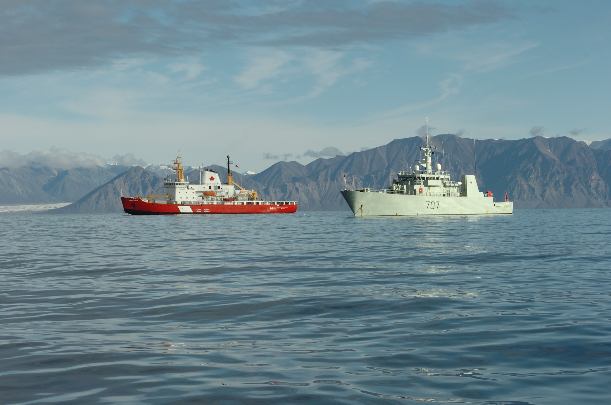 (GBY006) HMCS Goose Bay refueling with the Coast Ship the Pierre Radisson during OP NARWHAL - 03 Aug 2002 // RCN image # HS022502d22 (GBY007) HMCS GOOSE BAY 707 passing by an iceberg - 07 Apr 2003 // RCN image # HS030260d01 // Old neg. no. HS2002-0434-10. (GBY008) HMCS GOOSE BAY 707 passing Jetty NB, HMC Dockyard, Halifax, NS - 14 Aug 2003 // Photographer: MCpl Colin Kelley, Formation Imaging Services, Halifax, Nova Scotia // RCN image # HS030699d25 (GBY009) HMCS GOOSE BAY circa 2005 // Photo of HMCS GOOSE BAY 707 taken from SHAWINIGAN 704 during the 2005 Loyal Mariner trip. We hit a peak of over 13M waves during a storm on our way to the Azores. At the height of the storm we rolled to 39 degrees and our props came out of the water and both shafts tripped causing a Engineering Emergency. The sweepdeck was under water as we rolled, almost causing a number of ships crew to be washed over the side while they were out on deck securing equipment. We got the shaftlines up and carried on. // Courtesy of Rick Bungay (GBY010) HMCS Goose Bay and the Coast Guard ship Henry Larson rest at anchor after the completion of OP LANCASTER, Pond Inet, Baffin Island - 21 Aug 2006 // Photographer: Sgt Dennis Power, Army News, CFB Shilo // DND-CAF image # AS2006-0515d