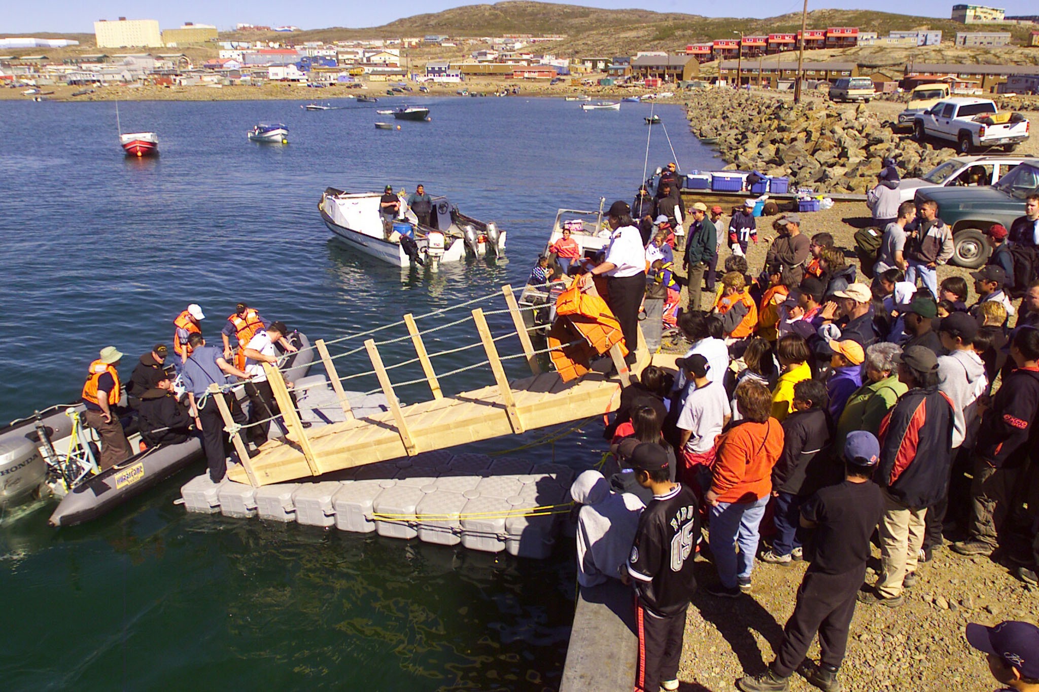 (GBY001) Official badge for HMCS GOOSE BAY 707 (GBY002) HMCS GOOSE BAY 707 departing Halifax for OP NUNAVUT - 23 Jul 2002 // Photographer: Cpl Paz Quillé / Formation Imaging Services Halifax // RCN image # HS020681d0 (GBY003) HMCS GOOSE BAY 707 alongside in it's namesake town of Goose Bay, Labrador with HMCS SUMMERSIDE 711 astern. Photo taken at sunset - 27 Jul 2002 // RCN image # HS022500d17 (GBY004) Residents of Iqaluit waiting for RIB rides to the HMCS GOOSE BAY 707 - 03 Aug 2002 // RCN image # HS022502d18 (GBY005) HMCS Goose Bay refueling with the Coast Ship the Pierre Radisson during OP NARWHAL - 03 Aug 2002 // RCN image # HS022502d21