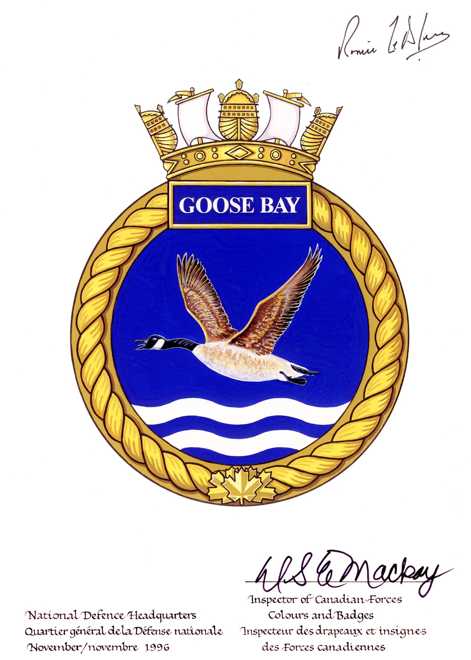 (GBY011) HMCS GOOSE BAY 707 taking part in a Photo Ex off Shearwater, Nova Scotia 02 Aug 2007 // Photographer: MCpl Carrie H. Roy, Formation Imaging Services, Halifax, Nova Scotia // RCN image # SW2007-00288-25 (GBY012) HMCS MONTREAL 336 and HMCS GOOSE BAY 707 shortly after departing St. John's, Nfld for OP NANOON 2010 - 03 Aug 2010 // Photographer: Corporal Rick Ayer, Formation Imaging Services, Halifax, Nova Scotia // RCN Image # HS2010-H001-017 (GBY013) Contents of frame plaque presented to the town of Happy Valley-Goose Bay, Newfoundland and Labrador in 2010 on the 100th anniversary of the creation of the RCN. // RCN image # RE2007-0058-214m (GBY014) HMCS GOOSE BAY 707, the French tall ship L'Hermione and Nova Scotia's own Bluenose II, sail in to Lunenburg, NS, 18 Jul 2015 // Photographer: LS Dan Bard, Formation Imaging Services Halifax // DND/RCN Photo. Crown Copyright 2015 (GBY015) HMCS GOOSE BAY 707 participating in the sail past at Halifax at the start of Exercise Cutlass Fury - 12 Sep 2016 // Courtesy of Clarence Hemeon