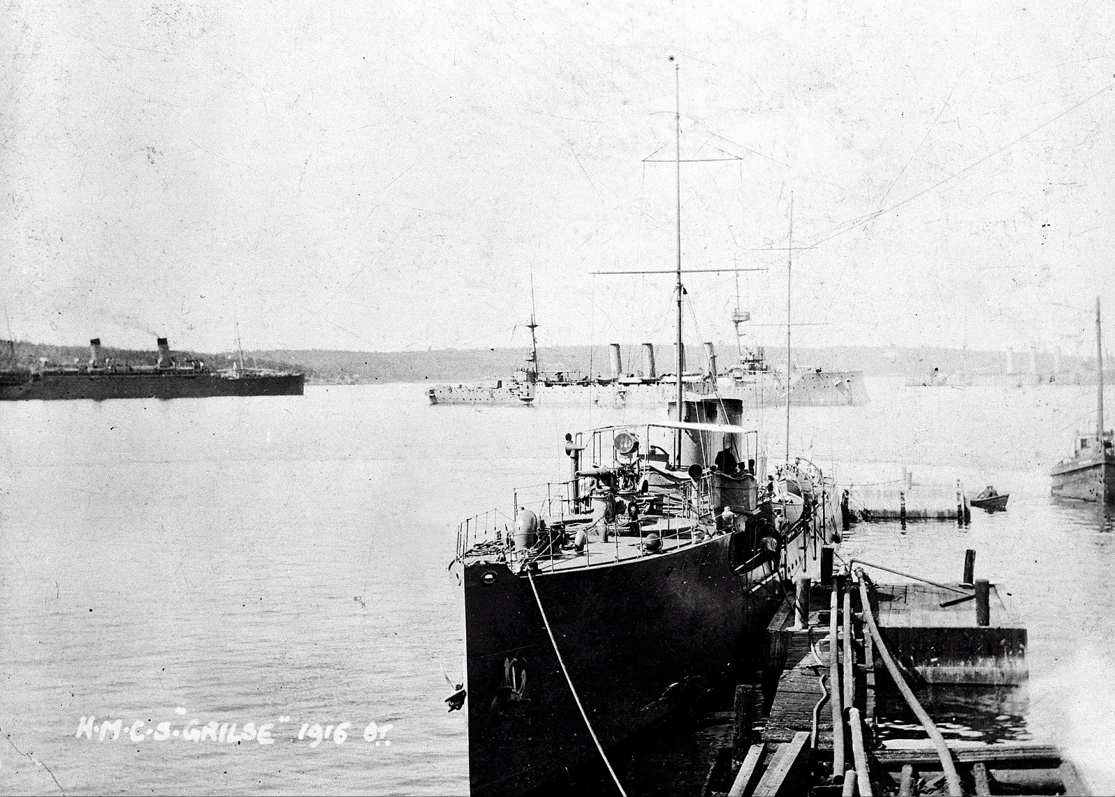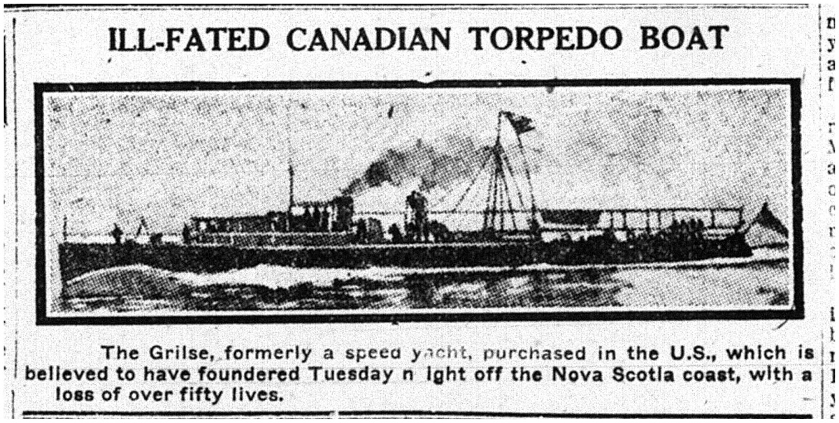 (GRL001) HMCS GRILSE - undated (GRL002) HMCS GRILSE in Bedford Basin 1916 // In this 1916 photograph, HMCS GRILSE is tied up at a dock in Halifax harbour. Halifax remained Canada's busiest harbour during the First World War, filled with civilian vessels (left) and warships (right) like those seen in the background. Shipments of war supplies, food, and soldiers arrived and left nearly daily. GRILSE was among the Canadian naval vessels involved in protecting ships along Canada's coast against U-Boat attacks. In the fall of 1916, however, GRILSE's high fuel consumption restricted its activities to special patrols to protect important ships. // Source: George Metcalf Archival Collection CWM 19940001-943 // Courtesy of the Canadian War Museum (GRL003) Article on HMCS GRILSE, believed to have foundered in a storm // Dec 1916 // Source: Facebook post of Barry Archer (GRL004) HMCS GRILSE - date unknown (GRL005) HMCS GRILSE firing a torpedo // This rare colourized photograph captures the launch of a torpedo from HMCS GRILSE, a civilian yacht converted to a quick torpedo boat for patrol and escort duties. The torpedo tube seen here (centre) and two 12-pounder guns were the ship's main armament. Like the guns, the torpedo tube could be rotated to aim the weapon at enemy ships. A spare torpedo for reloading the tube can be seen in the foreground. By the time of this photograph, newer, larger and more powerful torpedoes were in widespread service, but GRILSE's 14-inch models could still inflict significant damage. // Source: George Metcalf Archival Collection CWM 19940001-948_1 // Courtesy of the Canadian War Museum