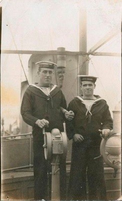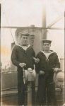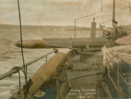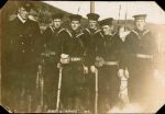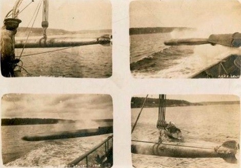(GRL006) Torpedo Practice, HMCS GRILSE // These photographs show HMCS GRILSE taking part in a torpedo firing exercise, a type of practice important for maintaining the ship's fighting efficiency. The photographs at top right and bottom left show one of GRILSE's torpedoes being fired. Torpedoes were expensive and complicated weapons, and every effort was made to recover them after test firing. "Practice heads" made the torpedoes float at the end of their runs so that they could be recovered easily by small boats like the one seen at bottom right. // Source: George Metcalf Archival Collection CWM 19940001-947 // Courtesy of the Canadian War Museum (GRL007) Two crew members of HMCS GRILSE // Sailor Isaac Ernest Brown (right) and an unidentified comrade pose on the open bridge of HMCS GRILSE. Brown, on the right, rests his hand on the ship's wheel. The other sailor rests his right hand on the bridge telegraph, which sent a signal to the engine room to reduce or increase speed, or to reverse the engines. GRILSE, built as a civilian yacht, retained its open bridge after conversion to a torpedo boat. Without protection, the bridge could be a wet and miserable place when GRILSE ventured out to sea. // Source: George Metcalf Archival Collection CWM (GRL008) Sailors of HMCS GRILSE // Jack Ross (left), seen here with armed members of HMCS GRILSE's crew including one carrying a cutlass (right), purchased the GRILSE for Canadian naval service. Deemed medically unfit for overseas army service, Ross, one of the wealthiest men in Canada, sought a place in the navy by obtaining fast American yachts for the Canadian government. After purchasing the first vessel, which became HMCS Tuna, he was appointed a naval lieutenant. In 1915, Ross acquired another yacht, which became GRILSE, a ship he would command from October 1915 to July 1916. // Source: George Metcalf Archival Collection CWM 19940001-945 // Courtesy of the Canadian War Museum 19820331-005 // Courtesy of the Canadian War Museum
