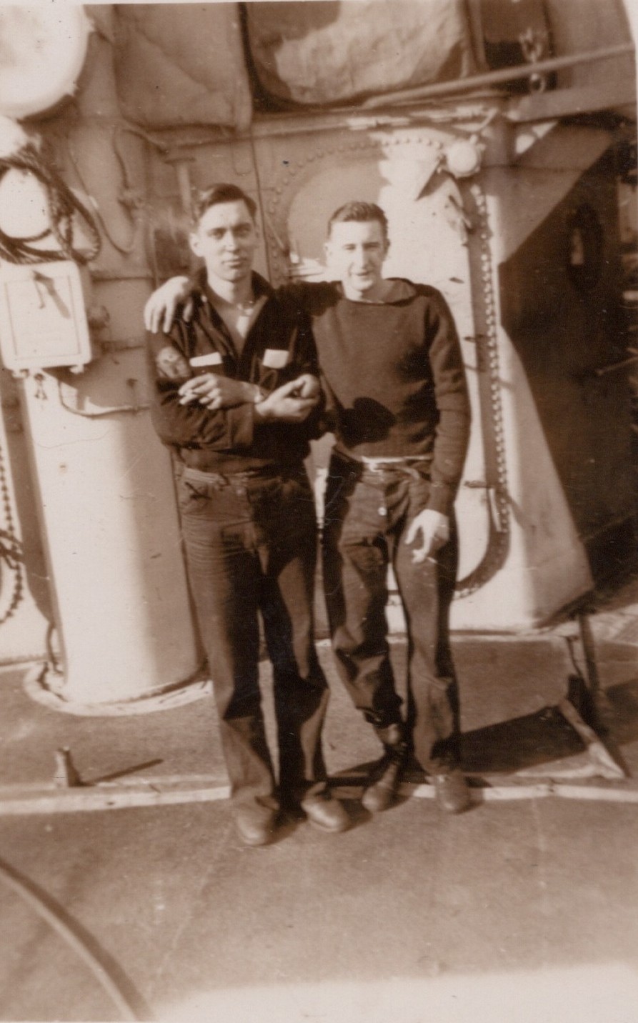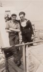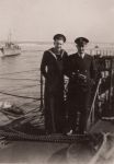 (JNC038) Ship's badge of HMCS HAMILTON I24 (JNC039) The ship's bell and badge of HMCS HAMILTON I24 (JNC040) James Cox (right) with unknown Chief Petty Officer on HMCS HAMILTON I24 (JNC041) James Cox (right) with unknown Chief Petty Officer on HMCS HAMILTON I24 - with a Fairmile Motor Launch in the back ground. (JNC042) Unknown sailors in a mess deck on HMCS HAMILTON I24