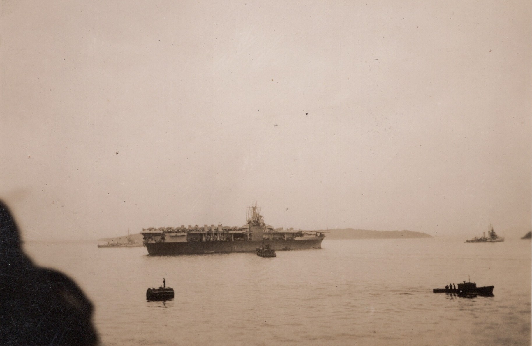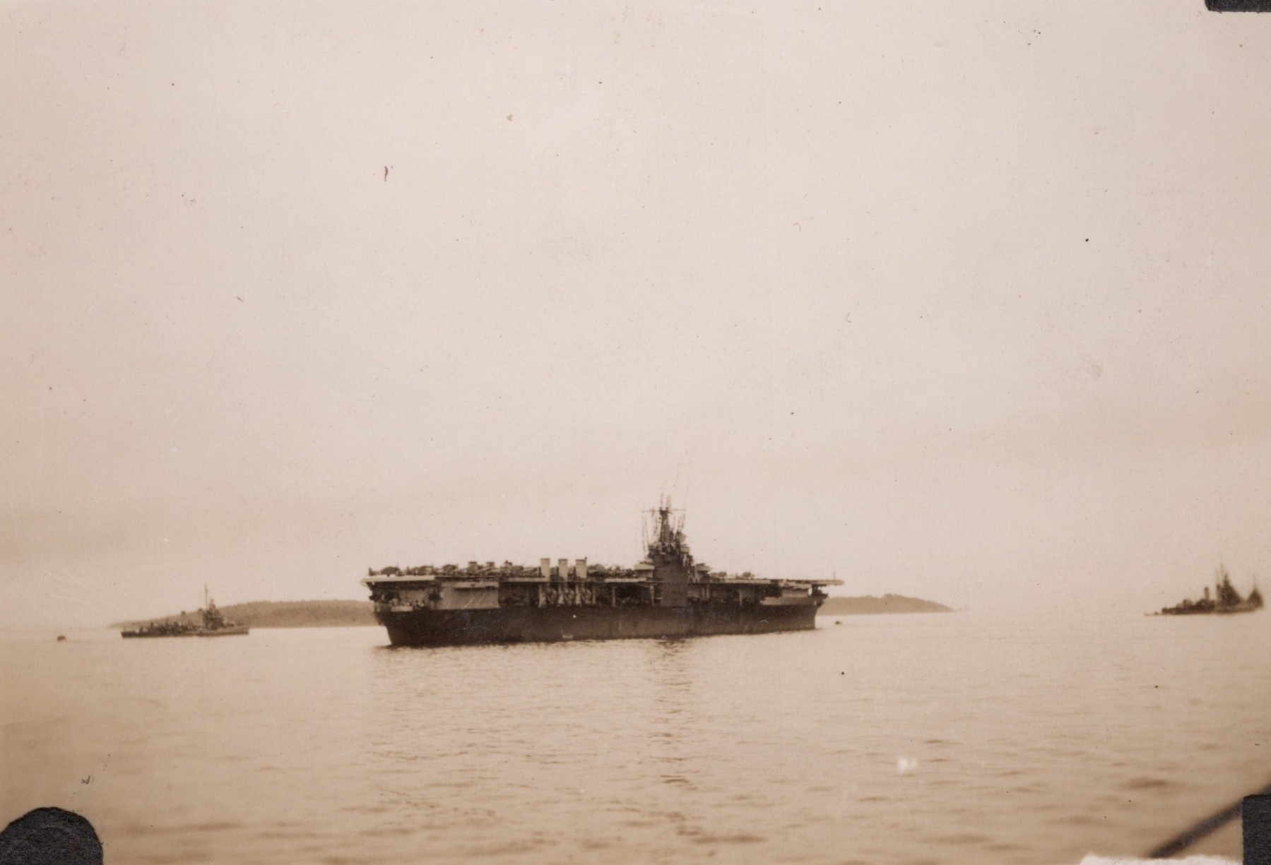 JNC053 (JNC053) Unknown American aircraft carrier with her destroyer escorts. Photo believed to have been taken in Halifax Harbour.