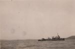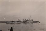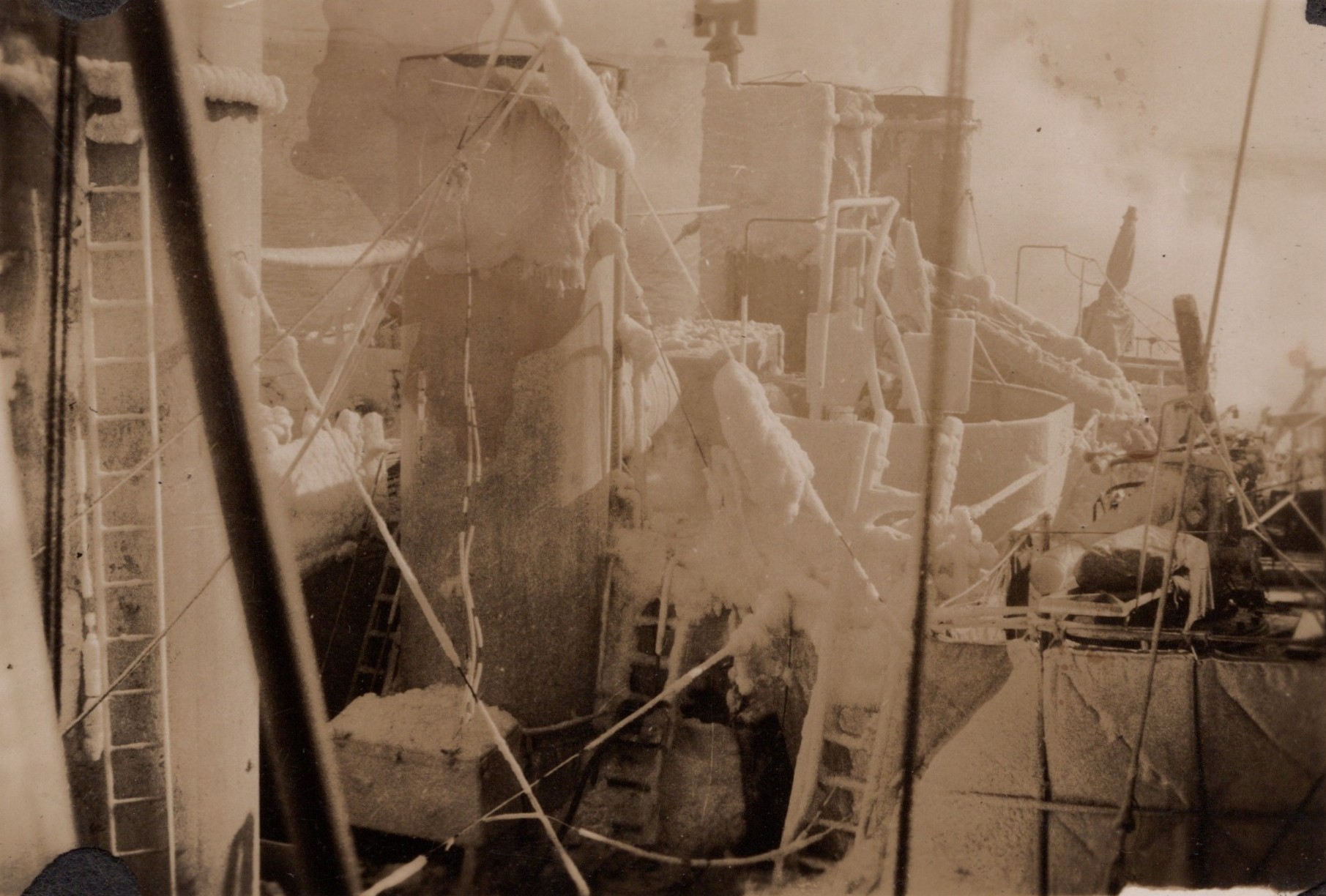 (JNC077) HMCS HAMILTON I24 entering unknown harbour while an unknown warship, visible astern of her, heads out to sea (JNC078) Unknown harbour shoreline (JNC079) Depth charge explodes astern of HMCS HAMILTON I24 (JNC080) HMCS HAMILTON I24 - Looking aft down the port side from the bridge (JNC081) Unknown Town-class destroyer covered in ice. Based on the angle of the photo, the photo appears to be taken from HMCS HAMILTON I24 of a ship alongside her
