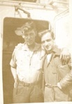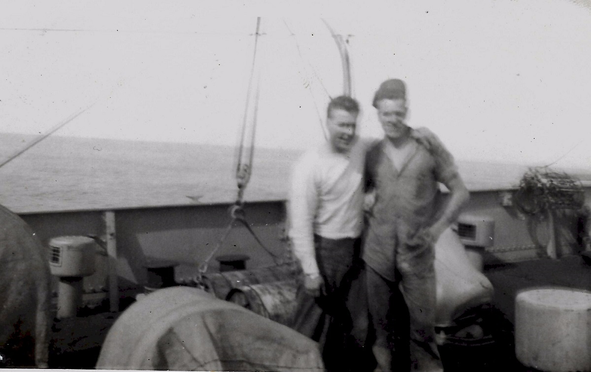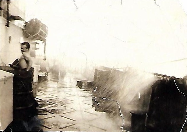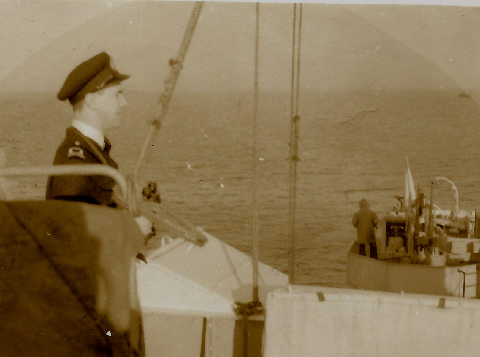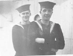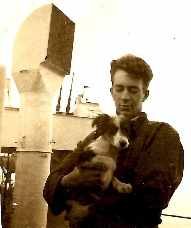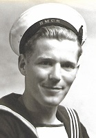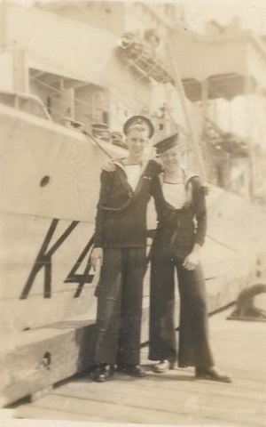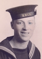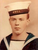 Information provided by Judy's mother is as follows: the boat was strafed by an enemy plane. Both the fellow who died and your father were on Pom Pom guns. My understanding was the man standing beside your father was shot and your father was hit by a piece of metal that took the top layer of skin off in a small area center chest just below the neck. It left a scar. The fellow who died was well liked. He often entertained below deck by step dancing. He was from some place on the east coast of Canada and it was from him that Ken learned step dancing. There were several shipmates from the east coast and Ken also picked up the vocabulary and accent of those from Newfoundland. The sailor was buried at sea.