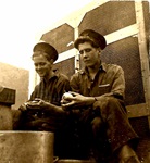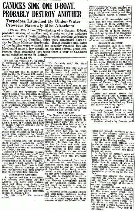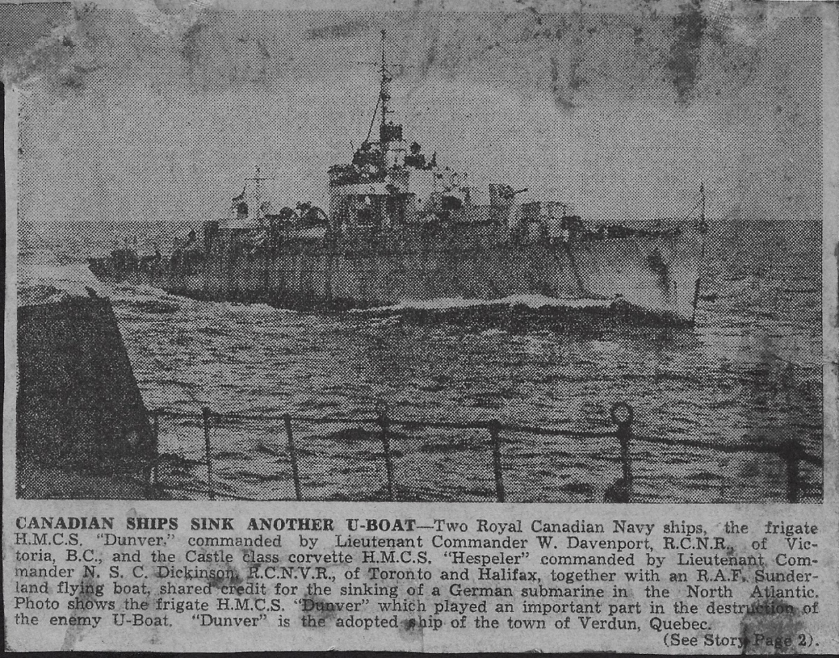 (RC13) Johnny Gosling (of Lockeport, NS) (left) and Vic Cooper (of Quebec) on HMCS HESPELER (RC14) Campbell (left) and Cowen on HMCS HESPELER (RC15) A/SLt Cowen on HMCS HESPELER (RC16) Grabowski (top) and Demers on HMCS HESPELER (RC17) Newspaper article on HMCS HESPELER and HMCS DUNVER sinking a U-boat From the collection of Ron Critchley, RCNVR Courtesy of Diane Brown
