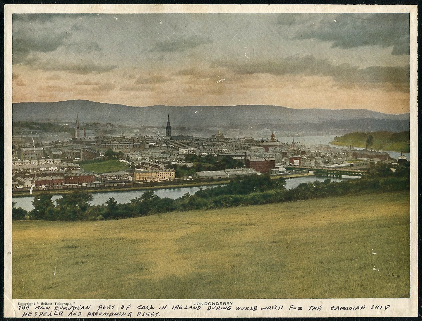 (JB06) Newspaper article on the sinking of U-484 by HMCS HESPELER and HMCS DUNVER (JB07) Print of Londonderry during WW II - "The main European port of call in Ireland during World War II" (JB08) Survivors report of Premier-Maitre Emile Cloarec, soul survivor from the loss of the French submarine La Perle, who was picked up by HMCS HESPELER. Original source unknown From the collection of John Berard, AB, RCNVR Courtesy of John Berard Jr.