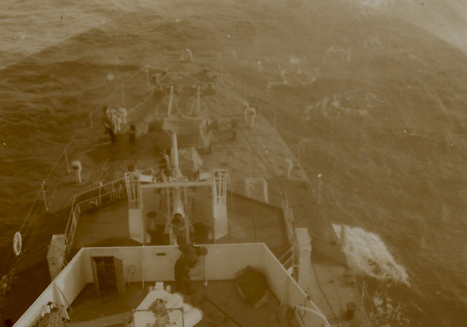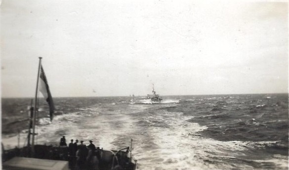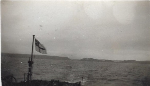 (RH08) Rad and shipmates on HMCS HESPELER (RH09) Rad on the quarterdeck of HMCS HESPELER 1944 (RH10) Escort Group in line ahead. HMCS HESPELER in the foreground (RH11) Coast of Ireland. Webmaster's note: the shore in the background looks like the entrance to St. John's Harbour, Newfoundland (RH12) HMCS RUNNYMEDE K678 approaching HMCS HESPELER at sea
