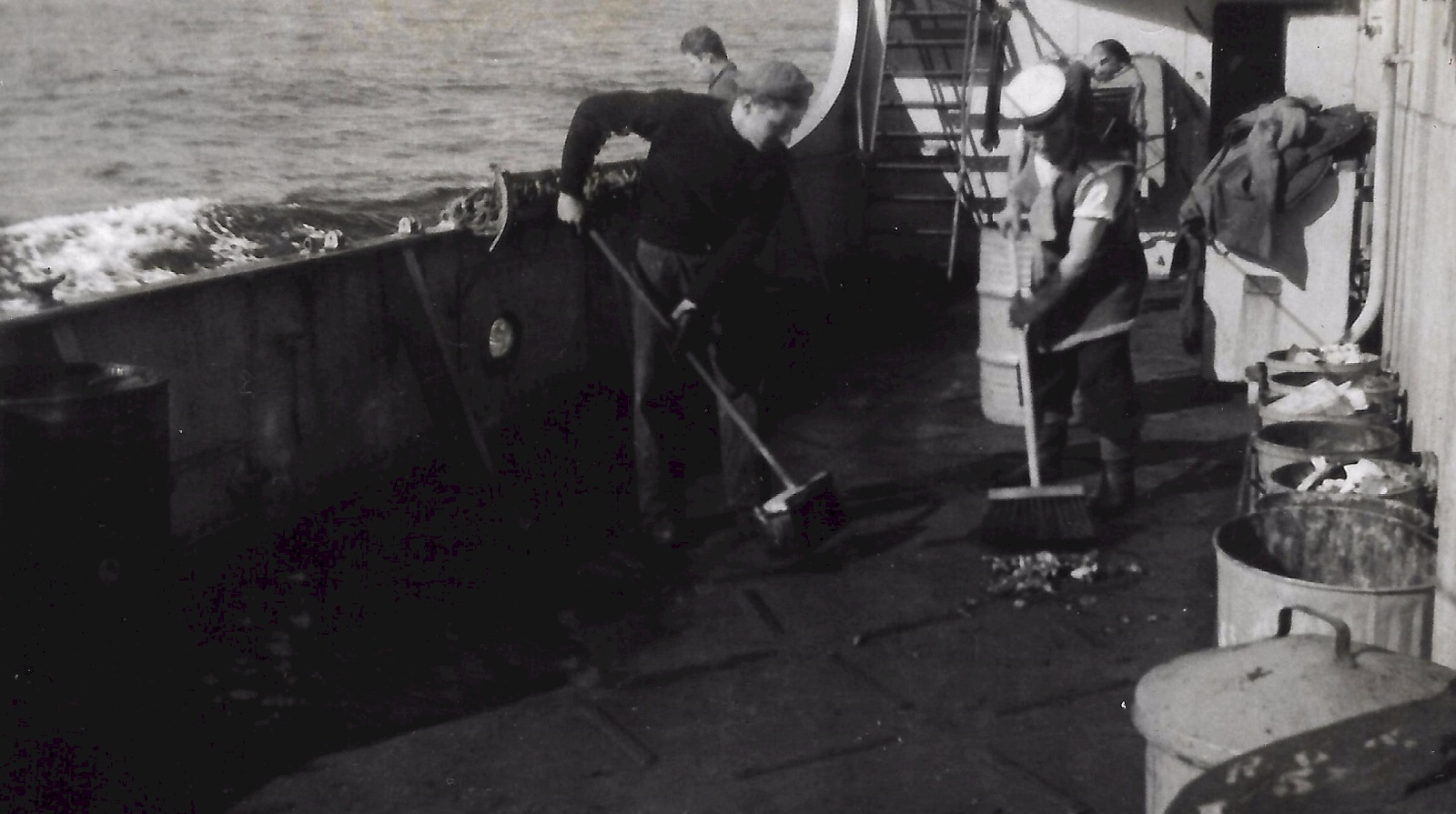(RC08) Pepper and Sparky on HMCS HESPELER (RC09) Ron Critchley on the AA mount on HMCS HESPELER (RC10) Allison and Comish scrubbing the deck on HMCS HESPELER (RC11) Beswick, Demers and unknown on HMCS HESPELER K489. Note: it is not known which sailor is Beswick or Demers (RC12) PO Red & Mackie on HMCS HESPELER