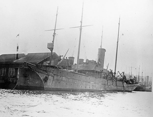 Owing to funding cutbacks after the war there were no resources for manning the ships with naval crews and at the end of March 1920 the White Ensign was hauled down and the ship was re-commissioned as the Canadian Government Steamship HOCHELAGA with a civilian crew under the Blue Ensign. The CGS HOCHELAGA was re-fitted as a yacht for the Governor General and the Duke of Devonshire embarked in July 1920 for an extended tour of the Gulf of St. Lawrence ports. This harmless excursion was the basis of a diplomatic eruption as the Governor of Newfoundland was also at sea in HMS Calcutta commanded by a British Rear-Admiral. When the Calcutta encountered the HOCHELAGA in Newfoundland territorial waters the Newfoundland Governor was affronted with the infringement of the sovereignty of his domain and the ensuing wrangle between two representatives of H.M. King George V went on for several months. SS HOCHELAGA in Pictou. Photo courtesy of Charles E. Frohman Collection/Hayes Presidential Center.