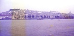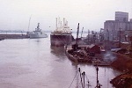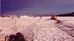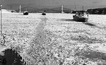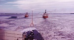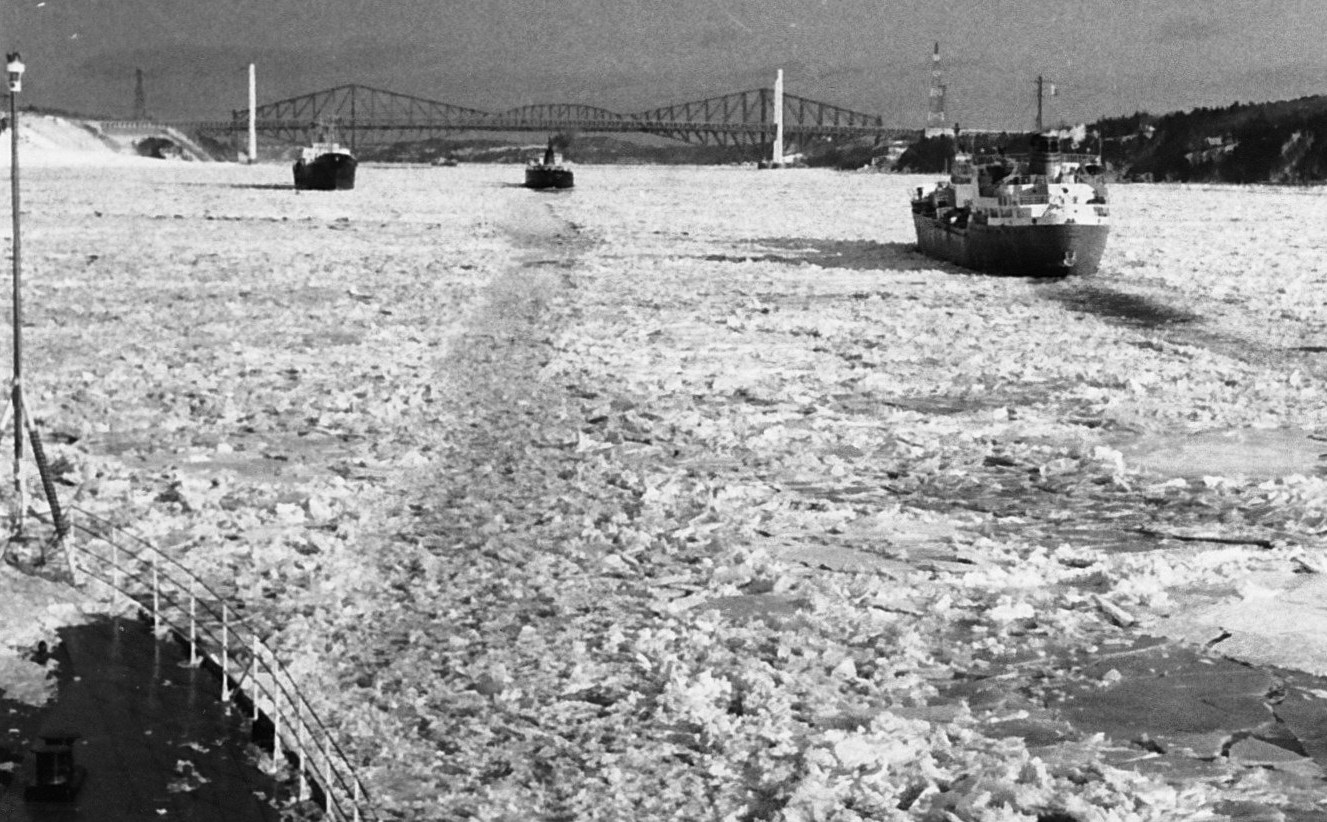 (HG104) Passing by Trois-Rivieres (HG105-HG106) Approaching pont de Québec at Quebec City (HG107) ALGONQUIN under construction at Davie Shipbuilding Co., Lauzon, Quebec (HG108) Approaching a railway bridge over the St. Lawrence Note: The early departure was justified. The river was icing up but, even worse, overnight snow settled on the river ice and created a total white-out. With navigation marks lifted, it was impossible early in the day to distinguish water from land. The competence and professionalism of the St. Lawrence River pilots (3 of them) was never more appreciated. It was also helpful to follow in the wake of Coast Guard ships.