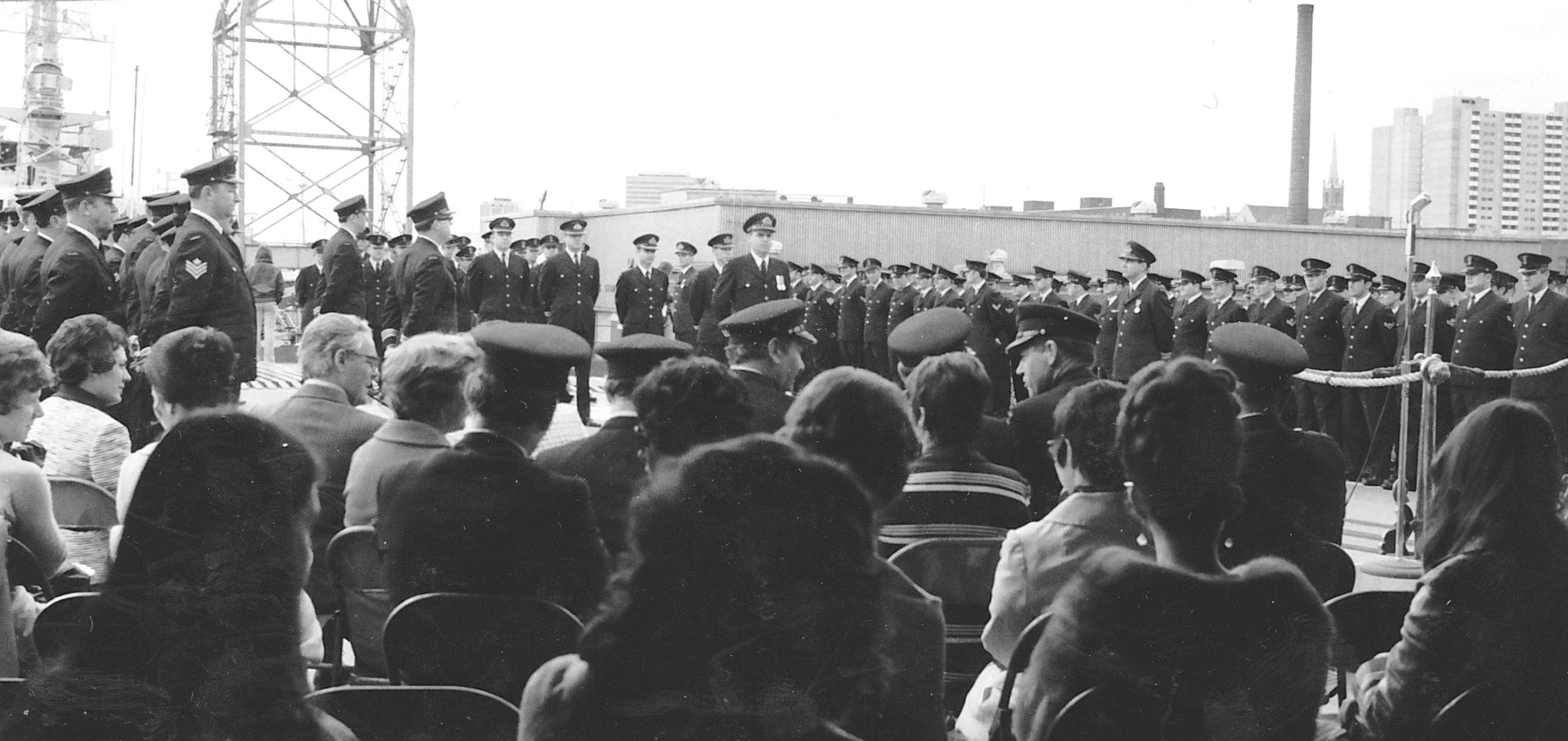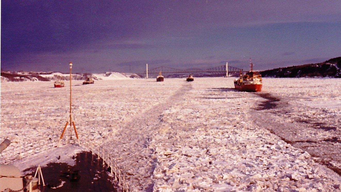 ** The Commissioning date was set for 16 Dec 1972. However, by mid December the weather deteriorated quickly and the Seaway was about to be closed. The CO and Navo made an aerial inspection of the river condition from a Coast Guard helicopter. The river ice was setting in. It was decided to advance the commissioning date to the 14th Dec and sail immediately after.