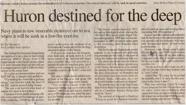 Later in her career, she was transferred to Esquimalt, BC. She served on MARPAC missions protecting Canada's sovereignty in the Pacific Ocean and enforced Canadian laws in its territorial sea and Exclusive Economic Zone. HURON was also deployed on missions throughout the Pacific and to the Indian Ocean; specifically the Persian Gulf and Arabian Sea on anti-terrorism operations.