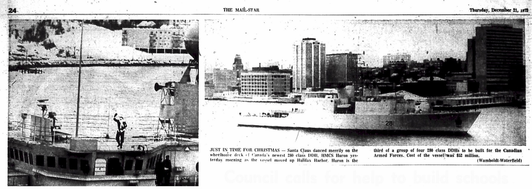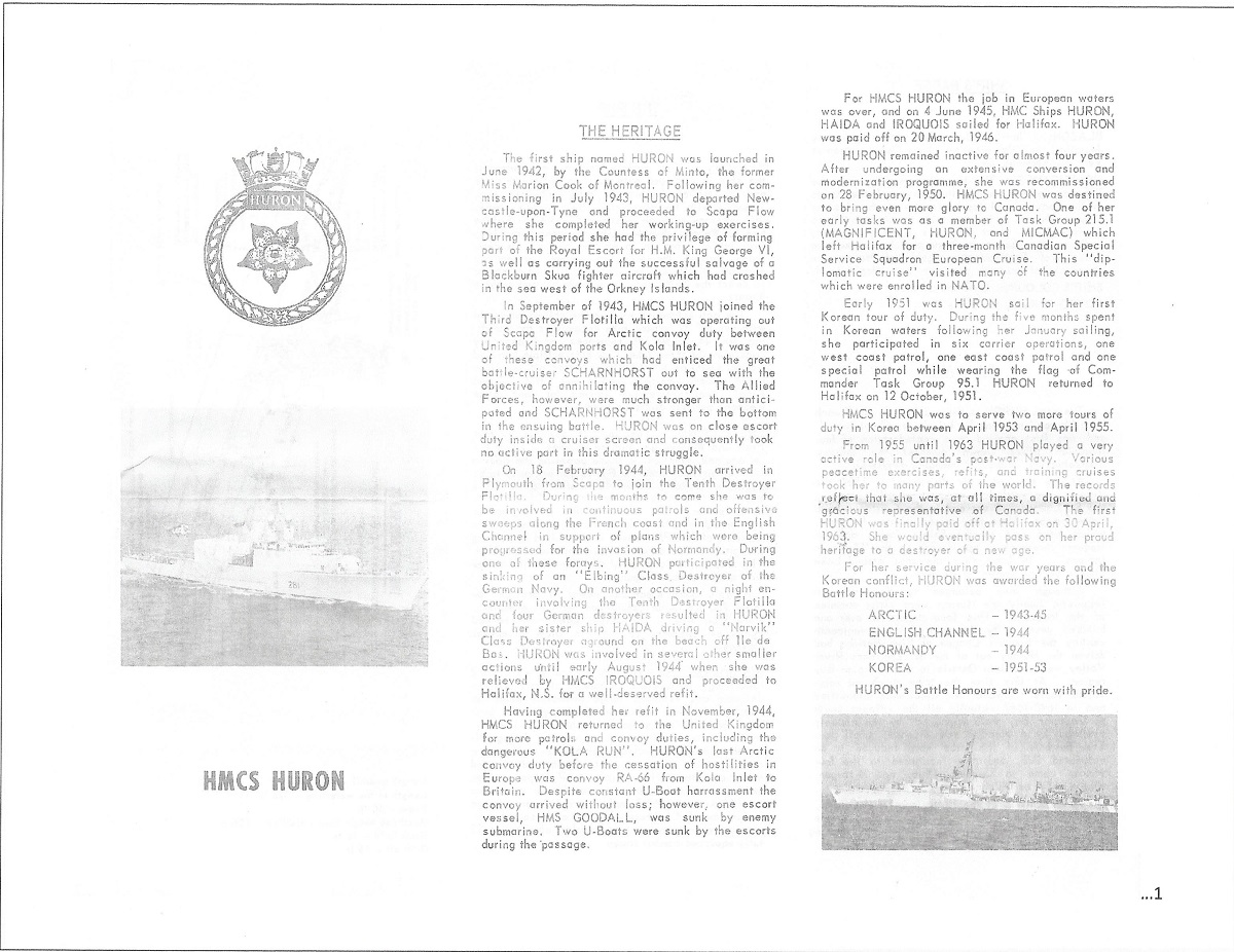 HURON represented Canada at the Silver Jubilee Naval Review at Spithead on 28 Jun 1977, and in 1981 carried Governor-General Edward Schreyer on a tour of five Scandinavian ports.