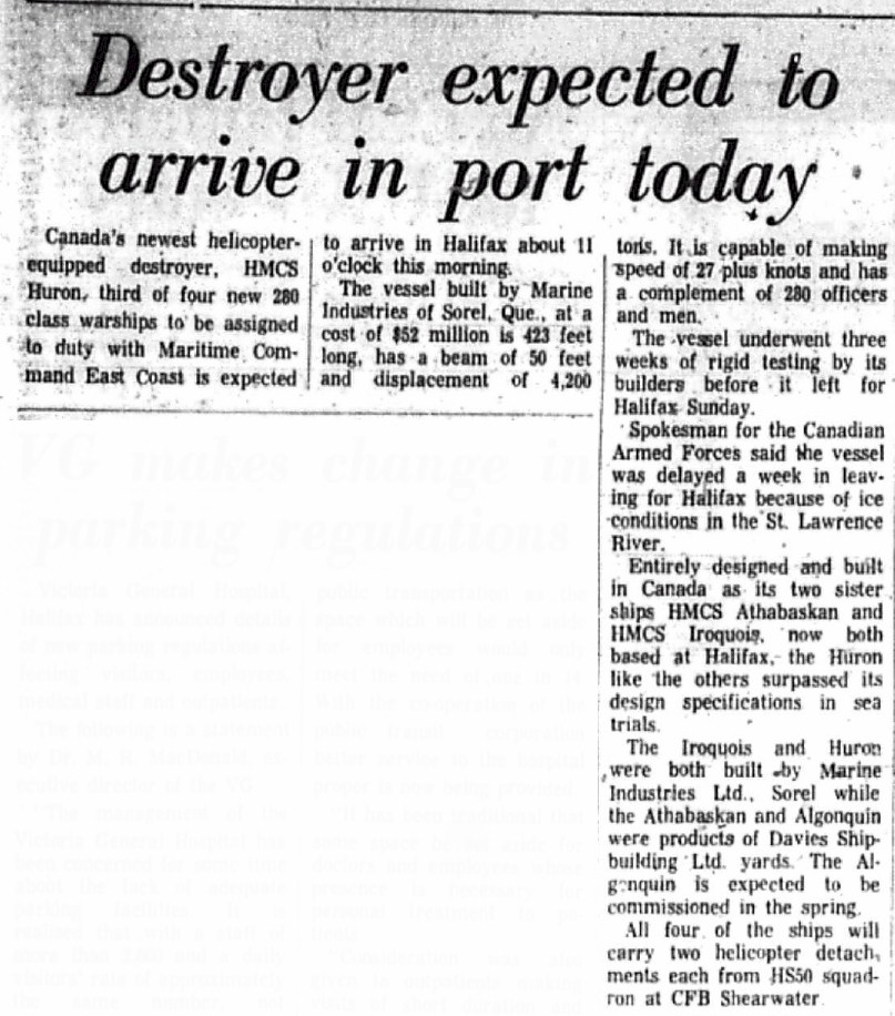 Built by Marine Industries Ltd., Sorel, HURON was commissioned on 14 Dec 1972. The Commissioning date was set for 16 Dec 1972. However, by mid December the weather deteriorated quickly and the Seaway was about to be closed. The CO and Navo made an aerial inspection of the river condition from a Coast Guard helicopter. The river ice was setting in. It was decided to advance the commissioning date to the Dec. 14 and sail immediately after. The early departure was justified. The river was icing up but, even worse, overnight snow settled on the river ice and created a total white-out. With navigation marks lifted, it was impossible early in the day to distinguish water from land. The competence and professionalism of the St. Lawrence River pilots (3 of them) was never more appreciated. It was also helpful to follow in the wake of Coast Guard ships. (submitted by Heinz Gohlish, Lt, RCN)