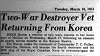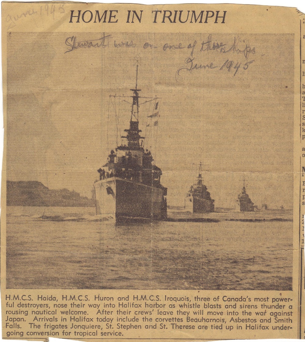 (OSA011) Newspaper article Jun 1945 - HAIDA, HURON and IROQUOIS arrive in Halifax harbour. Also returned same day BEAUHARNOIS, ASBESTOS and SMITH FALLS. JONQUIERE, ST STEPHEN and STE THERESE are tied up in Halifax undergoing tropicalization refit