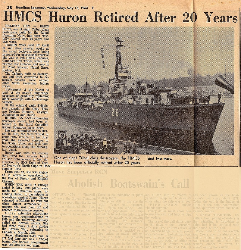 HMCS HURON 216 Retired After 20 Years The Hamilton Spectator 15 May 1963 Click on the above article to view a larger image