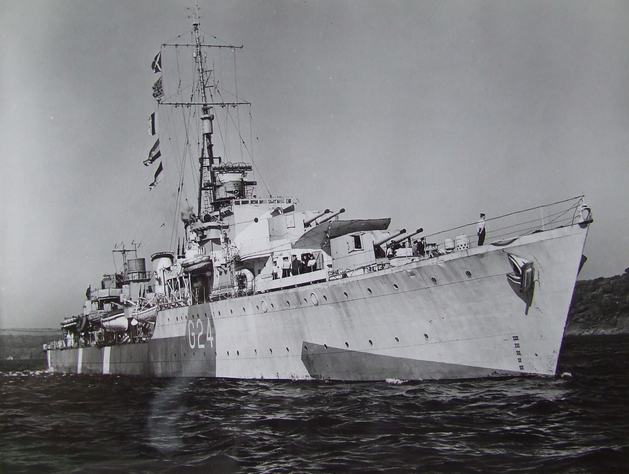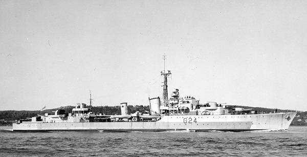 Built by Vickers-Armstrong, Ltd., at Newcastle-on-Tyne, she was commissioned there on 19 Jul 1943. She was assigned, like HAIDA, to the 3rd Destroyer Flotilla of the British Home fleet. She made a trip in Oct 1943 to Murmansk with technical personnel and special naval stores, and for the rest of the year escorted convoys to and from North Russia. In Feb 1944, she joined the 10th Flotilla at Plymouth for invasion duties, spending the next seven months in the Channel and the Bay of Biscay. She was present on D-Day. HURON assisted HAIDA in sinking torpedo boat T29 and destroyer Z 32, and in Aug 1944 made her fist visit to Canada for refit at Halifax. In Nov 1944 she returned to the U.K. to carry out escort duties in the Western Approaches. In April 1945, HMCS HAIDA G63, HMCS HURON G24 and HMCS IROQUOIS G89 made one more round trip escorting a convoy to and from Kola Inlet.