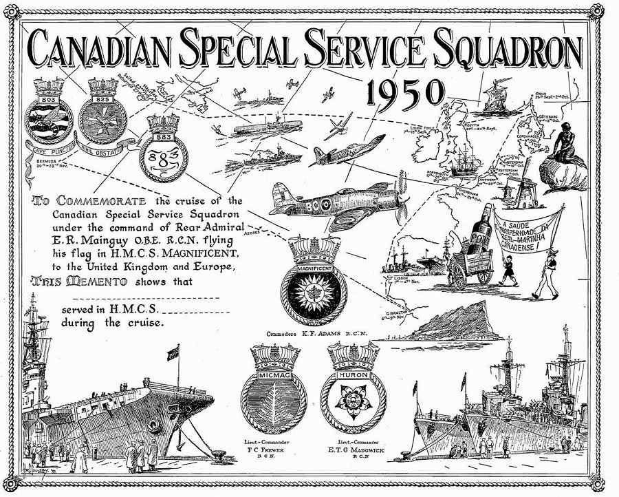 Special Service Squadron Cruise - 1950 HMCS MAGNIFICENT, HMCS HURON, HMCS MICMAC (SSS05) Article on the 1950 Special Service Squadron deployment from the Crowsnest magazine - courtesy of Erling Baldorf (SSS06) HMCS MAGNIFICENT in Rotterdam during the Canadian Special Service Squadron Cruise - courtesy of Dennis Cardy (SSS07-SSS08) HMCS MAGNIFICENT, flagship of the CSSS, visits Copenhagen; the largest warship to do so - Courtesy of Erling Baldorf