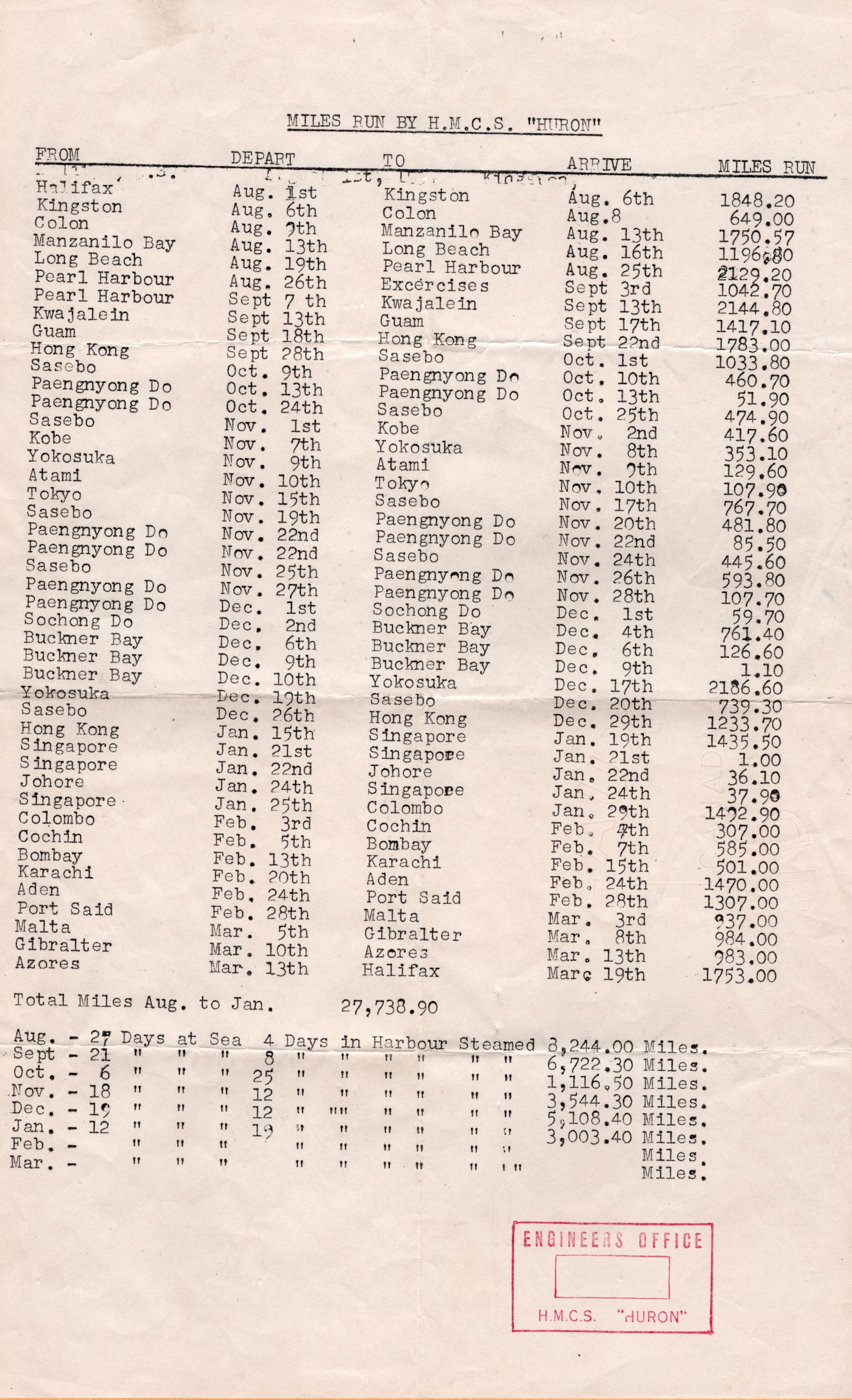 HMCS HURON's tours in Korea 1st Tour: Departed Halifax: 22 Jan 1951 // Arrived Op Area: 15 Mar 1951 // Departed Op Area: 14 Aug 1951 // Arrived Halifax: 21 Sep 1951 2nd Tour: Departed Halifax: 29 Apr 1953 // Arrived Op Area: 18 Jun 1953 // Departed Op Area: 05 Feb 1954 // Arrived Halifax: 17 Mar 1954 * 3rd Tour: Departed Halifax: 01 Aug 1954 // Arrived Op Area: 01 Oct 1954 // Departed Op Area: 26 Dec 1954 // Arrived in Halifax: 19 Mar 1955 * * Returned to Canada via the Suez Canal thus circumnavigating the globe.