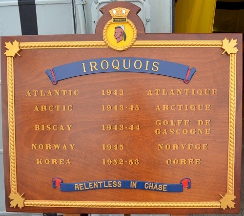 First of her class, she was built by Marine Industries Ltd. at Sorel and commissioned on 29 July 1972. In 1978, a fairly typical year for the period, she took part in exercises off Portugal, with French units in the Bay of Biscay, and with German units off the coast of Denmark, returning home on 07 Jul 1978 after logging some 14,300 nautical miles. In Sep 1980, IROQUOIS was the subject of shock trials for the 280 class. These took place off the coast of Nova Scotia. After the 3rd and largest of the explosions, IROQUOIS had to be towed. During this evolution, one of the tow lines parted and killed a crewman, Robert J. Purcell, on the tug Glenevis. On 4/5 Dec 1983, while on fishery patrol off the Grand Banks, IROQUOIS answered a SOS from the Panamanian-registered Ho Ming 5, in danger of capsizing owing to shifting cargo. In gale-force winds, the destroyer’s Sea King took off eleven of the twenty-man crew, the remaining nine being rescued by her Zodiacs. Eighteen of her ship’s company were decorated for their bravery during the episode. She underwent her TRUMP refit between 01 Nov 1989 and 03 Jul 1992. Between 25 Sep 1993 and 15 Apr 1994 served with the blockading force off the former Yugoslavia. While so employed she conducted 98 boarding. Relived by HMCS HALIFAX on 15 Apr 1994, she returned to Halifax, arriving on 25 Apr 1994. She was appointed flagship of Maritime Operations Group 1 (MOG 1) on 17 Jun 1995. Maritime Operations Group 1 left Halifax on 22 Feb 1996 and headed south for exercises, stopping in Grenada where she played host to Prime Minister Jean Chrétien and a number of Caribbean heads of state. Aug 1998 saw IROQUOIS replace ATHABASKAN as flagship of the NATO Standing Naval Force Atlantic (SNFL). She returned to Halifax on 15 Dec 1998.