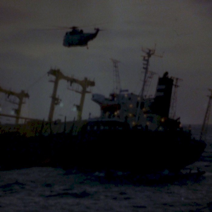 (DM01) The rescue of the crew of Ho Ming 5 by HMCS IROQUOIS - 05 Dec 1983. One of IROQUOIS' zodiacs is at the bottom right just below the stern of the Ho Ming 5