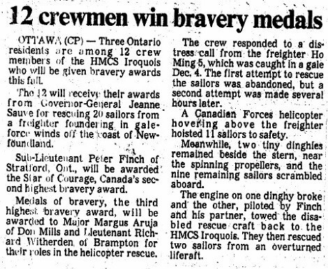 (IRO050) Write-up on the rescue of the crew of the Ho Ming 5 by HMCS IROQUOIS 280 on 05 Dec 1983. Four of HMCS IROQUOIS' Crew awarded the Star of Courage (IRO051) Chief of Defence Staff Commendation to the crew of HMCS IROQUOIS for the Ho Ming 5 rescue // Courtesy of George Damczyk (IRO052) Admiral Wood presenting PO2 Willy Wilson with a certificate relating to the Ho Ming 5 Rescue in Dec 1983 // Courtesy of Brian Lapierre