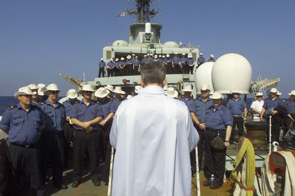 (JL11) Prayers onboard HMCS IROQUOIS 280 (JL12) 27 Feb 2003 - Sea King helicopter crashes on flight deck of HMCS IROQUOIS three days after departing Halifax to become flagship of multi-national Task Force 151 in Persian Gulf region. Two of the four helicopter crewmembers sustained minor injuries in the crash. IROQUOIS forced to return to Halifax Courtesy of John Le Forte