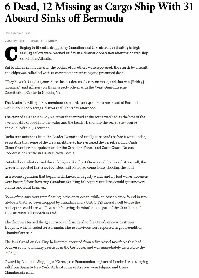 On 21 Mar 2000, IROQUOIS, as a member of a Canadian Task Group, left Halifax and headed south for spring exercises. While enroute south, news arrived that the bulk carrier Leader L. had gone down some 700 kilometres northeast of Bermuda. The task group was re-directed to offer assistance. When all was said and done, 13 survivors were picked up along with six bodies, 12 sailors were missing. IROQUOIS landed the survivors and bodies in Bermuda before rejoining the task group. Click here to read a write-up by Rear-Admiral John Newton on the Leader L. rescue