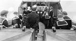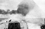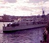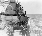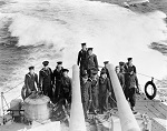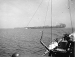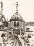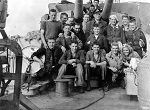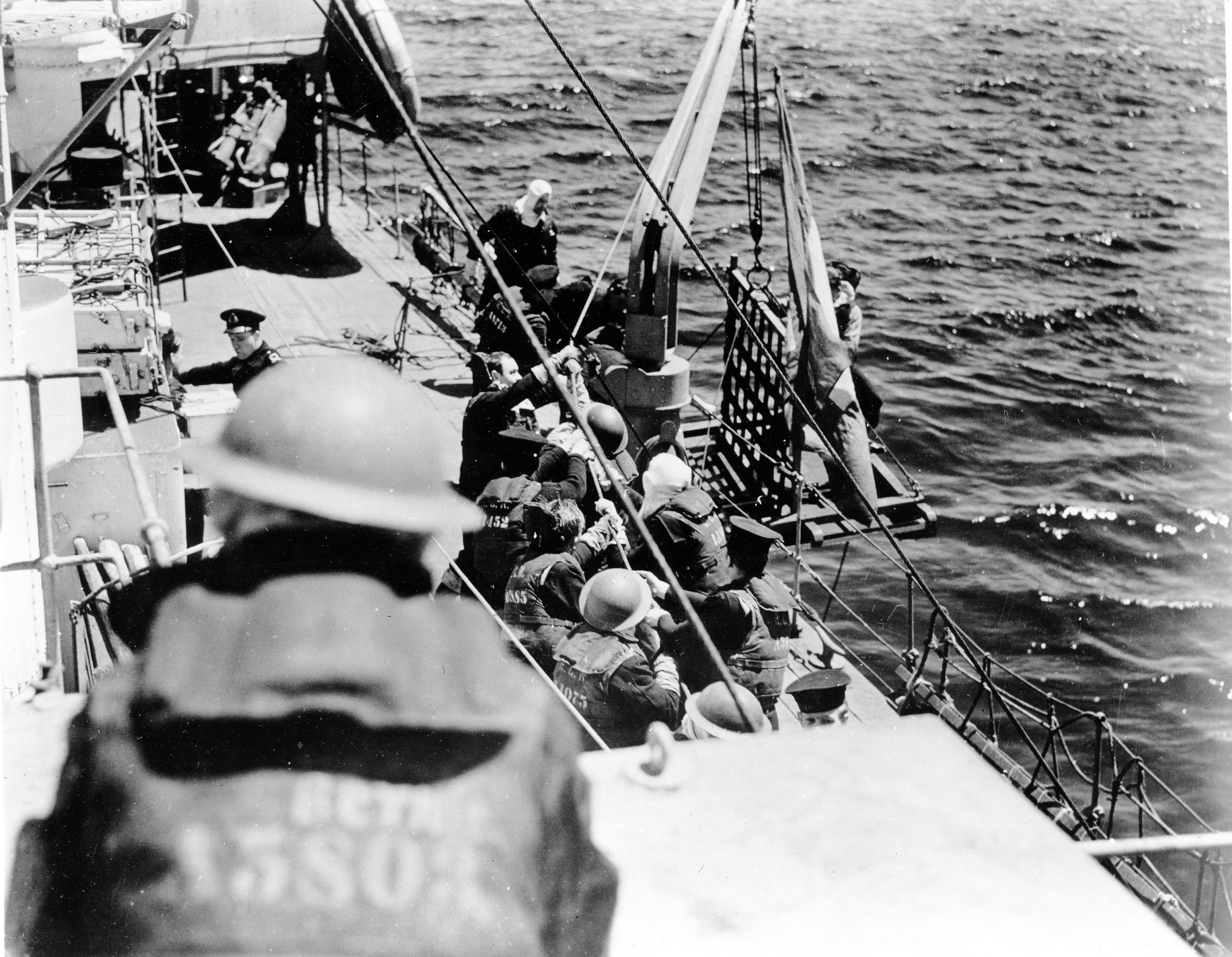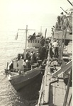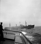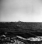 (RTL-LRB006) HMCS HURON dropping depth charges (RTL-LRB007) On August 26 1944, HMCS IROQUOIS met a small boat from Ile d'Yeu, a small channel Island. Onboard was the local school teacher who stated the Germans had left the Channel Island the day before. In their retreat the post office, radar installations and lighthouse had been destroyed, nineteen citizens and the mayor were also taken as prisoners. IROQUOIS sent a shore party ashore with supplies, food, chocolate, cigarettes and signalling equipment. The IROQUOIS sailors stepped ashore to much celebration. Remaining on the island overnight, the next morning there was a service at the graves of allied airmen, the sailors returned to IROQUOIS with details of enemy positions, minefields and shore defences. The locals also showered the sailors with flowers and a large iced cake, for IROQUOIS was the first allied force to arrive on the island (see also RTL-LRB026) (RTL-LRB008) Unknown Canadian Tribal class destroyer receiving a new gun and turret alongside in Plymouth, Possibly HMCS HAIDA in August 1944 (RTL-LRB009) HMCS IROQUOIS'S sea boat returns to the destroyer after sending a shore party to the liberated Channel Island of Ile d'Yeu on 27 August 1944. The grateful islanders showered the RCN sailors with flowers (visible on deck) and cake, being the first allied force to arrive on the island after the Germans had retreated. IROQUOIS'S shore party brought much needed food and supplies to the island residents (RTL-LRB010) Visitors to HMCS IROQUOIS, unknown date/location