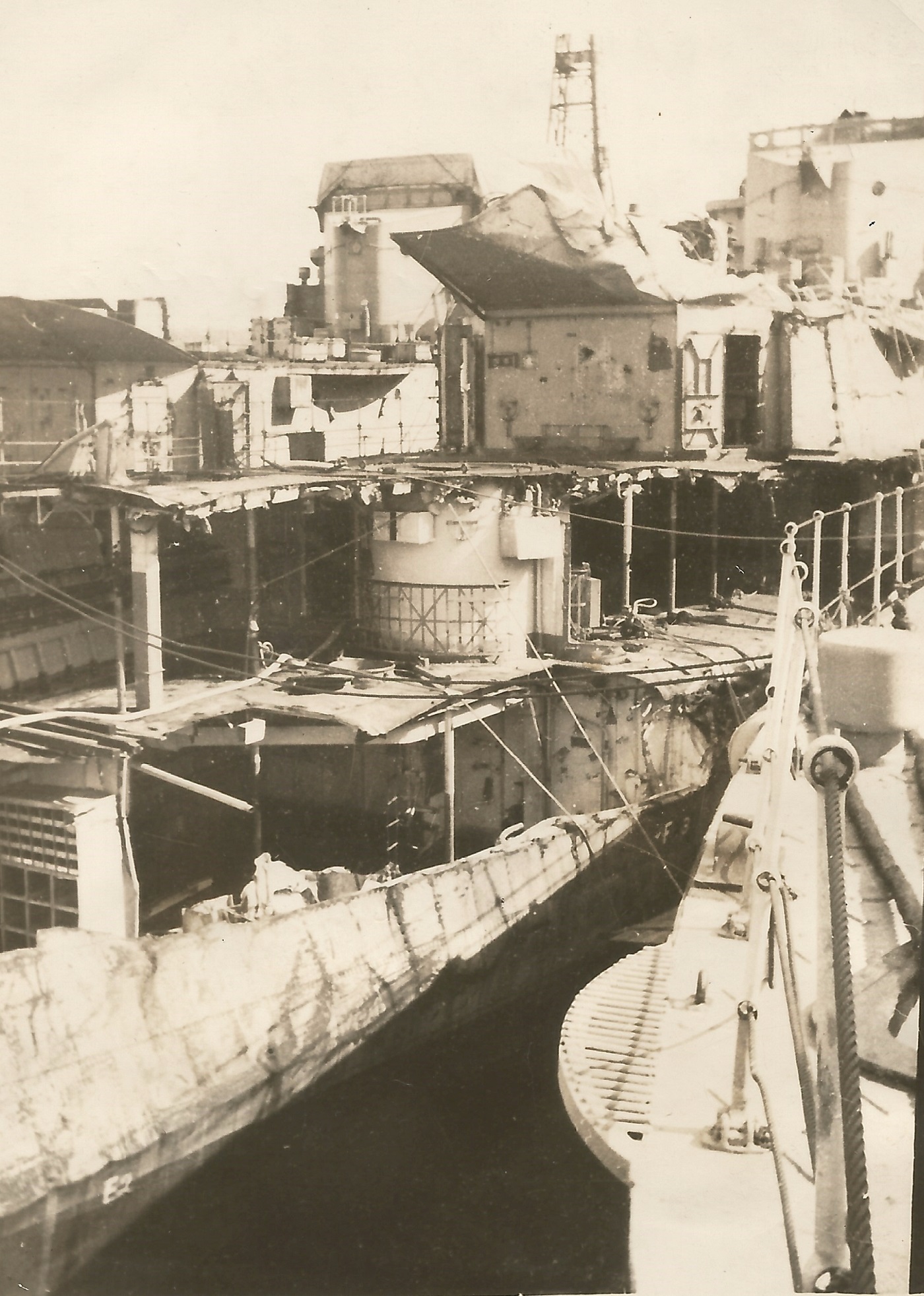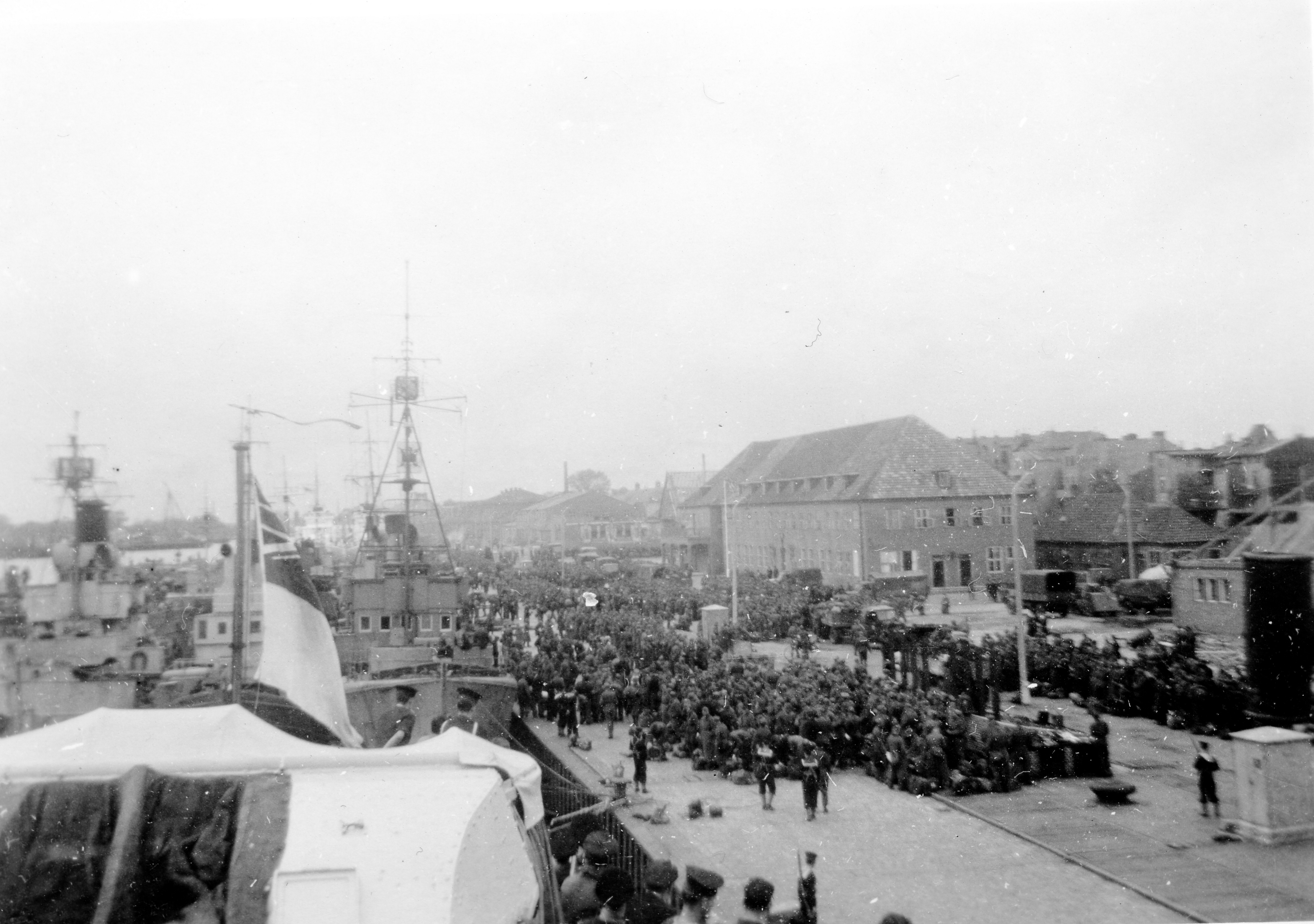 (RTL-LRB036) Admiral Hipper class cruiser, PRINZ EUGEN from HMCS IROQUOIS. The IROQUOIS is escorting PRINZ EUGEN and NURMBURG from Copenhagen, Denmark to Wilhelmshaven, Germany for the formal surrender. The two German cruisers and escort force departed Copenhagen on 27 May 1945, arriving the next day (RTL-LRB037) Admiral Hipper class cruiser, PRINZ EUGEN arriving at the locks at Wilhelmshaven, Germany from HMCS IROQUOIS (foreground) on 28 May 1945 (RTL-LRB038) Under the watchful eyes of armed RN sailors, thousands of German Prisoner-of-War have been gathered at the harbour in Wilhelmshaven, Germany on 28 May 1945. Photo taken from HMCS IROQUOIS (foreground) on her arrival in the German port after escorting the German cruisers PRINZ EUGEN and NURMBURG from Copenhagen, Denmark for their formal surrender to Allied forces (RTL-LRB039) HMS DEVONSHIRE with a surrendered German M class mine sweeper alongside in Oslo, Norway. Photo taken from HMCS IROQUOIS on 12 May 1945. The RN cruiser is flying the Norwegian flag from her aft mast. IROQUOIS and DEVONSHIRE provided escort to HMS APOLLO carrying the Crown Prince Olav of Norway and the exiled Norwegian government to Oslo (RTL-LRB040) View of dockyard at Wilhelmshaven, Germany from HMCS IROQUOIS as the Canadian destroyer arrived in the German city on 28 May 1945