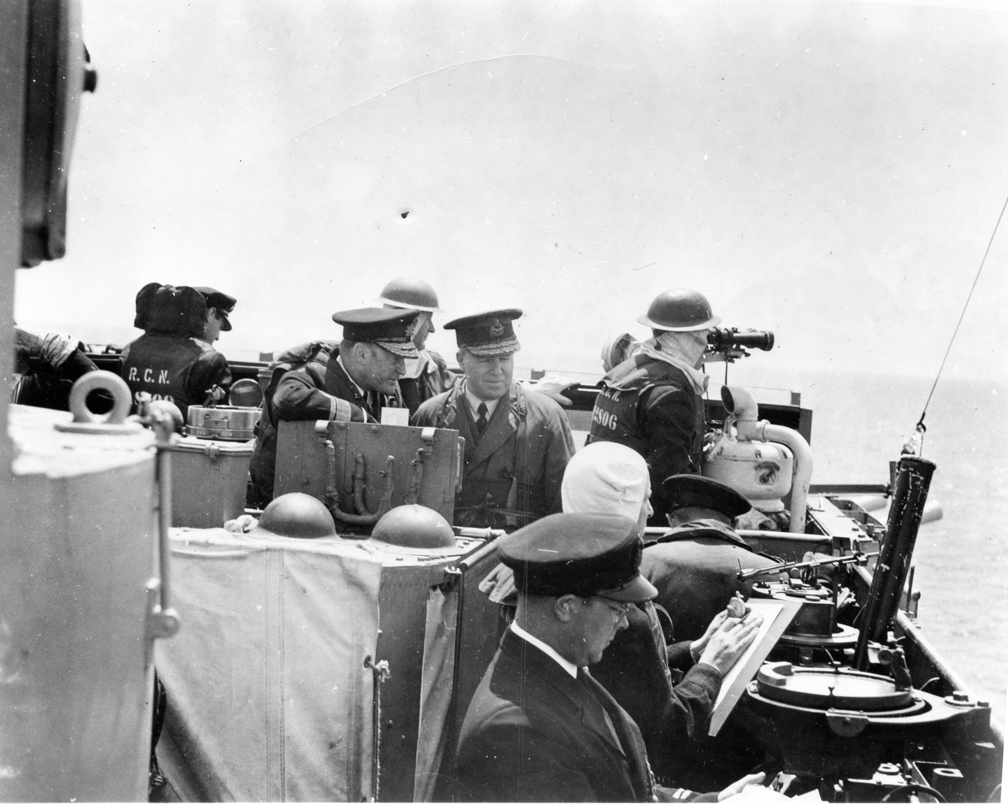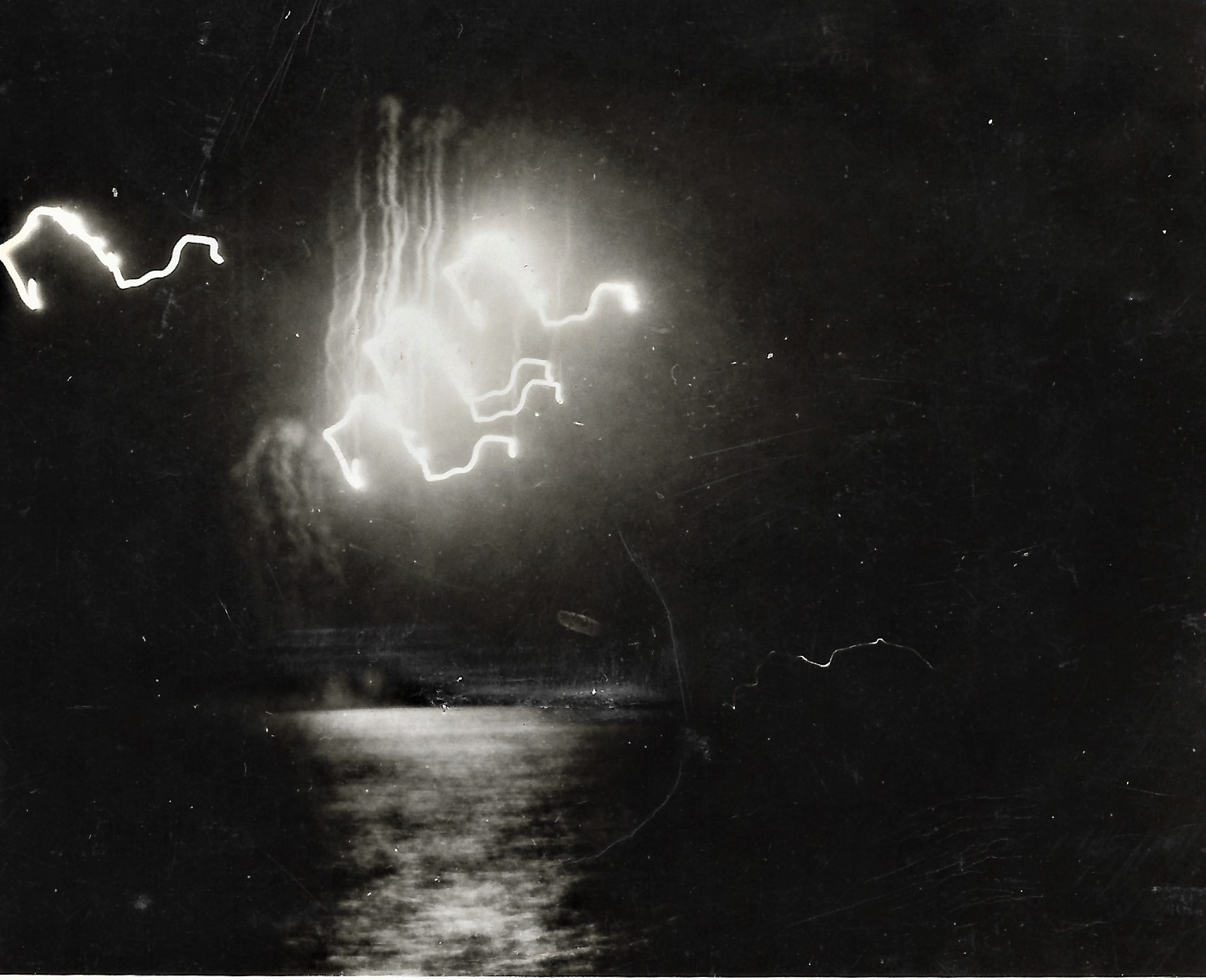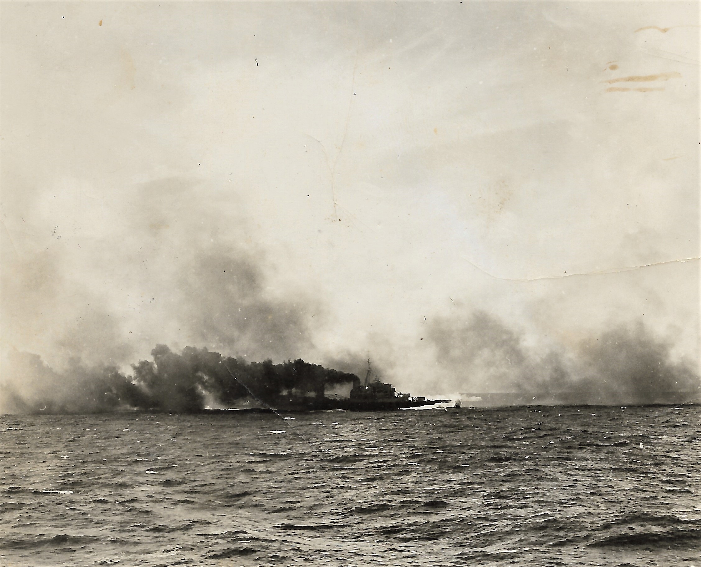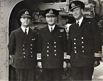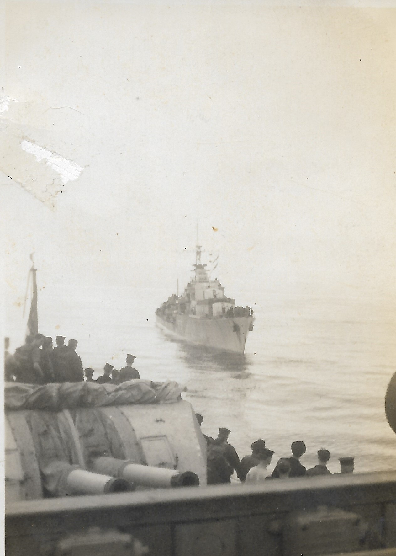 (RD21) HMCS IROQUOIS G89 (foreground) at Scapa Flow with unknown destroyer coming alongside (RD22) L-R: Cdr Harry Dewolf, Adm Fraser (Royal Navy) and, Cdr James Calcutt Hibbard on HMCS IROQUOIS G89 (RD23) Russell Dewe (centre) and two unknown shipmates (RD24) Starshells during night action in the Bay of Biscay (RD25) Unknown ship making smoke screen - photo taken from HMCS IROQUOIS who was also laying smoke