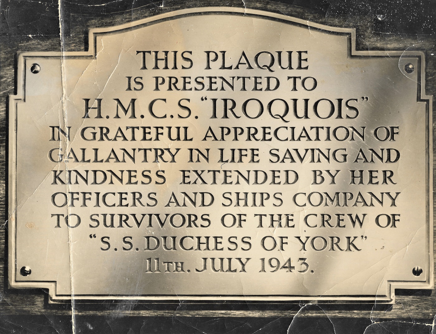 (RD26) Plaque presented to HMCS IROQUOIS G89 in appreciation of her rescuing 680 survivors from the troopship SS DUCHESS OF YORK that was sunk by German Aircraft on 11 Jul 1943 300 miles of Virgo, Spain (RD27) Unknown troop ship seen from HMCS IROQUOIS G89 (RD28) Drawbridge at unknown location (RD29) Unknown Algerine Class Minesweeper (RD30) Unknown coastline seen from HMCS IROQUOIS G89