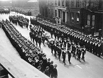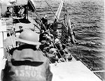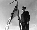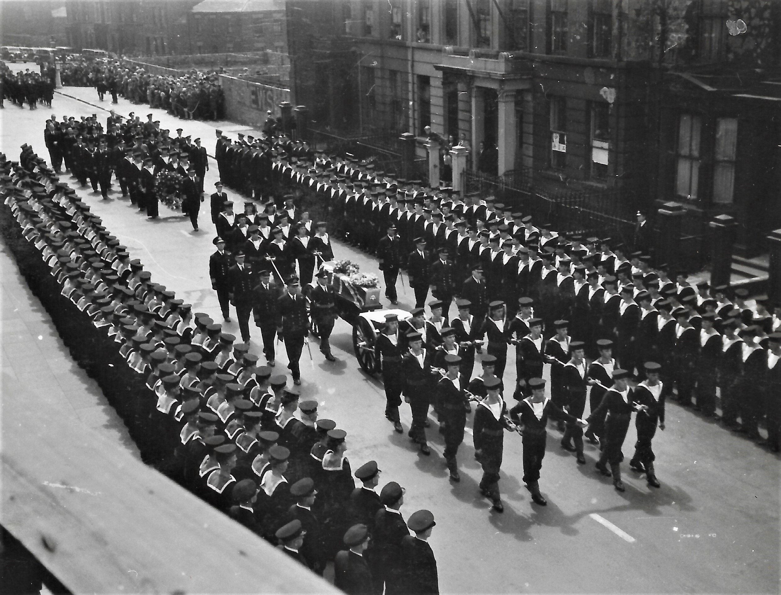 HMCS IROQUOIS ships company provides the Honour Guard during the funeral of Captain, Frederic John Walker, RN, CB, DSO & Three Bars in Liverpool on 11 July 1944. The funeral was attended by more than 1000 people, RN ratings carried his body on a gun carriage, escorted by sailors from IROQUOIS, through the streets of Liverpool to the dockyard. Walker's body was transferred to HMS HESPERUS for burial at sea. Captain Walker was the Commanding officer of HMS STARLING and Senior Officer of the 2nd Support Group. He was the most successful anti-submarine warfare commander during WWII and responsible for developing many of the tactics used against the U-Boats during the Battle of the Atlantic
