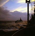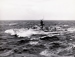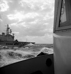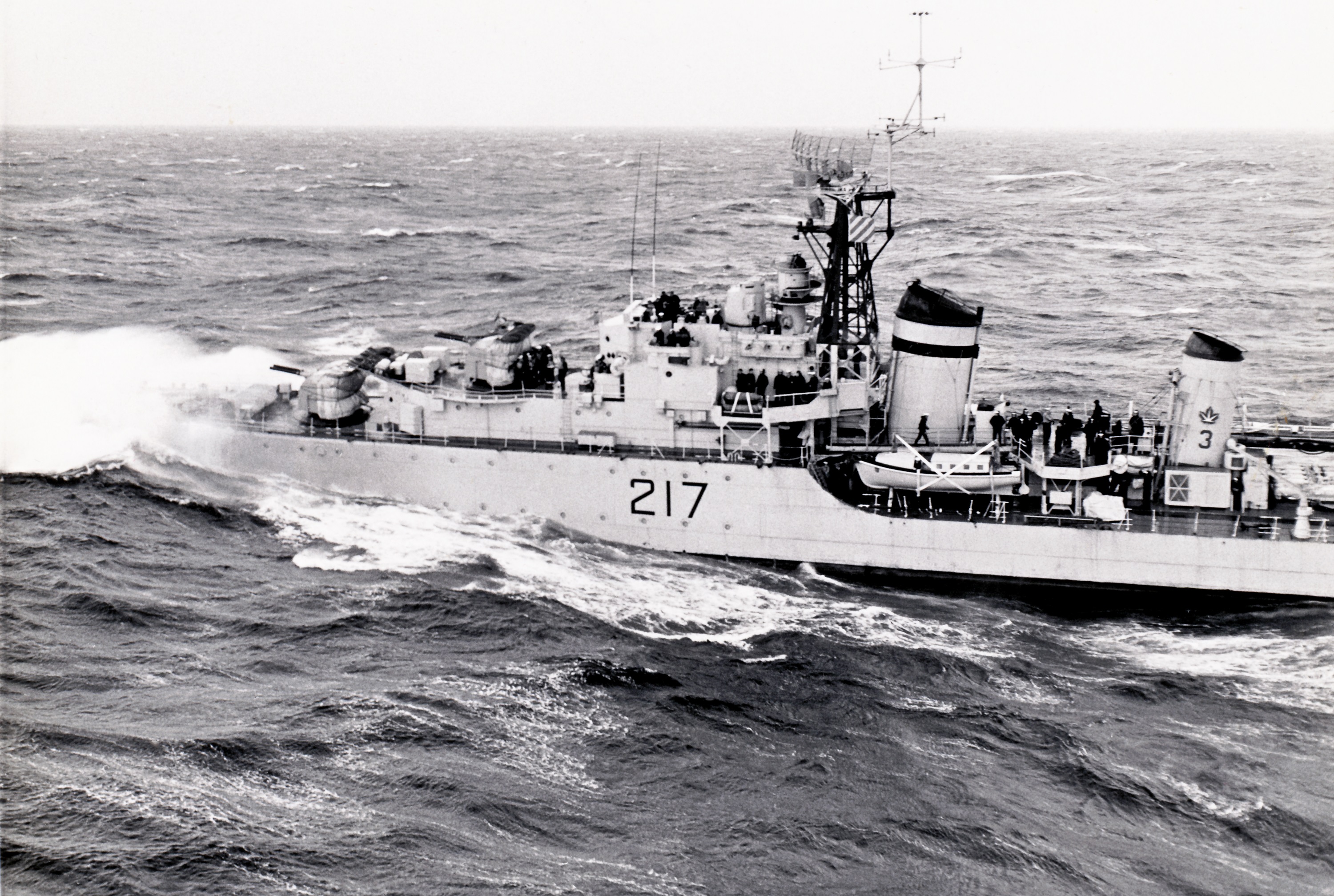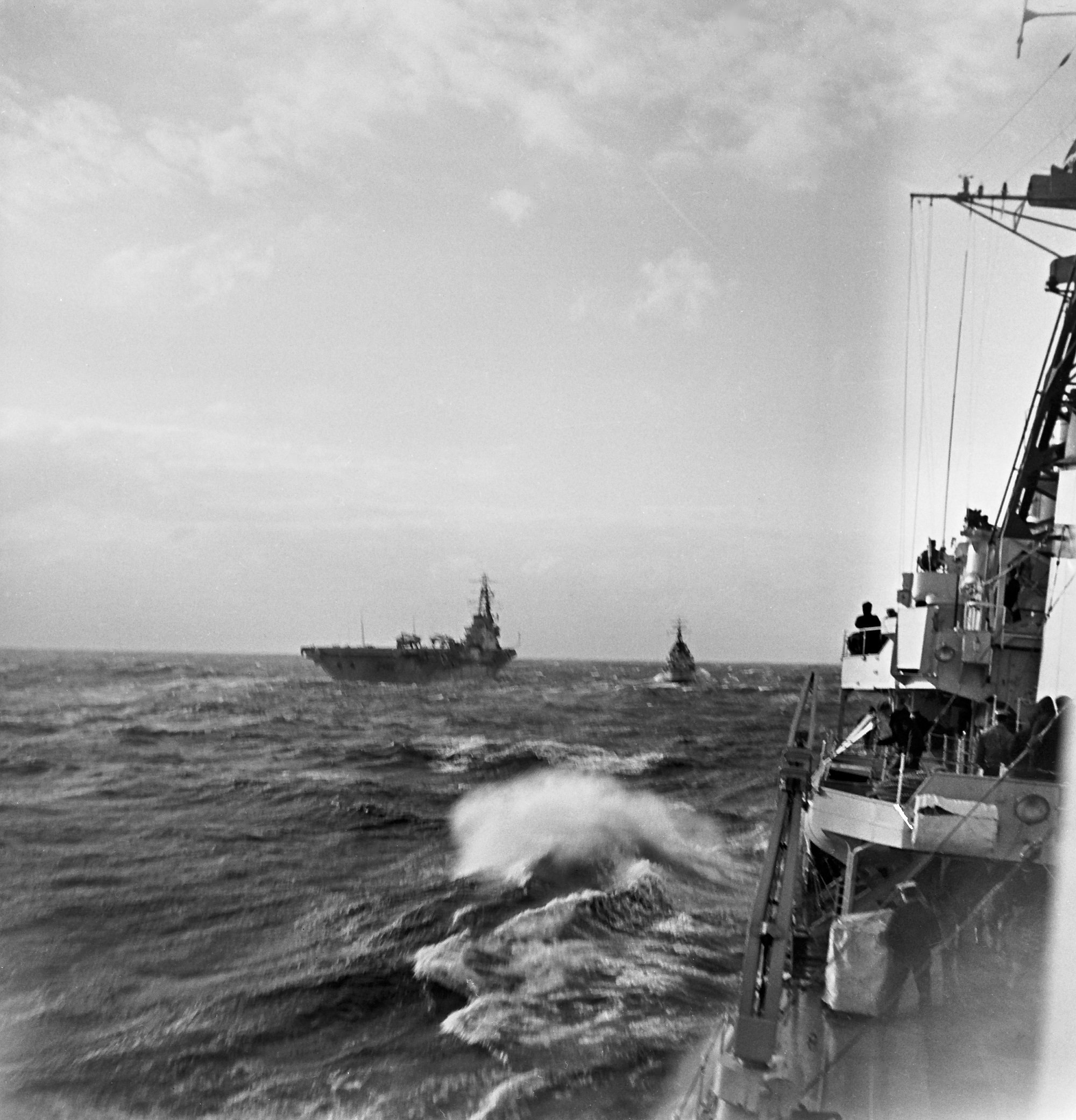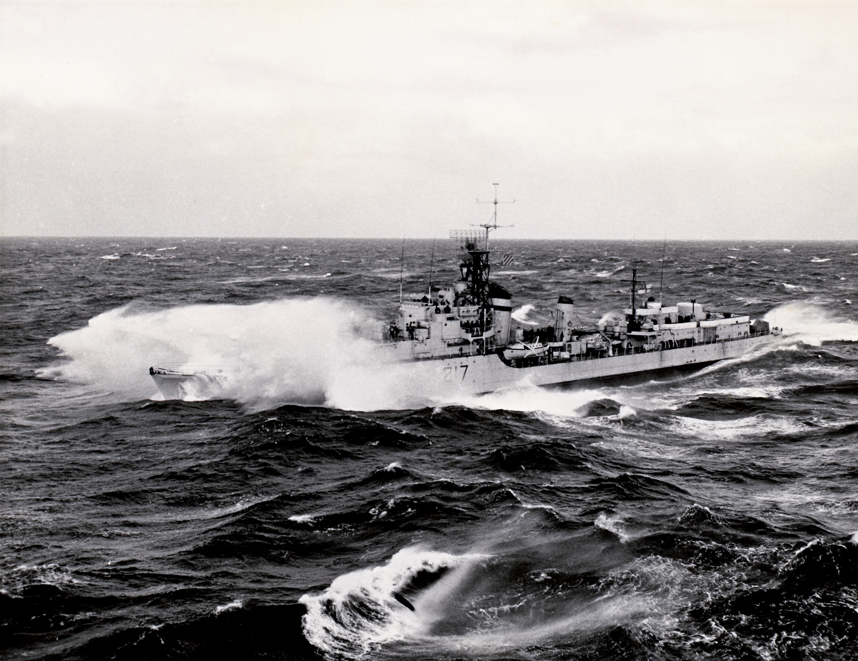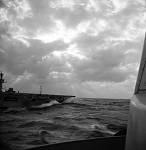 In Nov/Dec 1959, during a 6-week deployment that included a NATO Exercise, HMCS BONAVENTURE, in company with HMCS ALGONQUIN, HMCS IROQUOIS, HMCS SIOUX and HMCS ATHABASKAN encounter a major storm that battered the squadron.