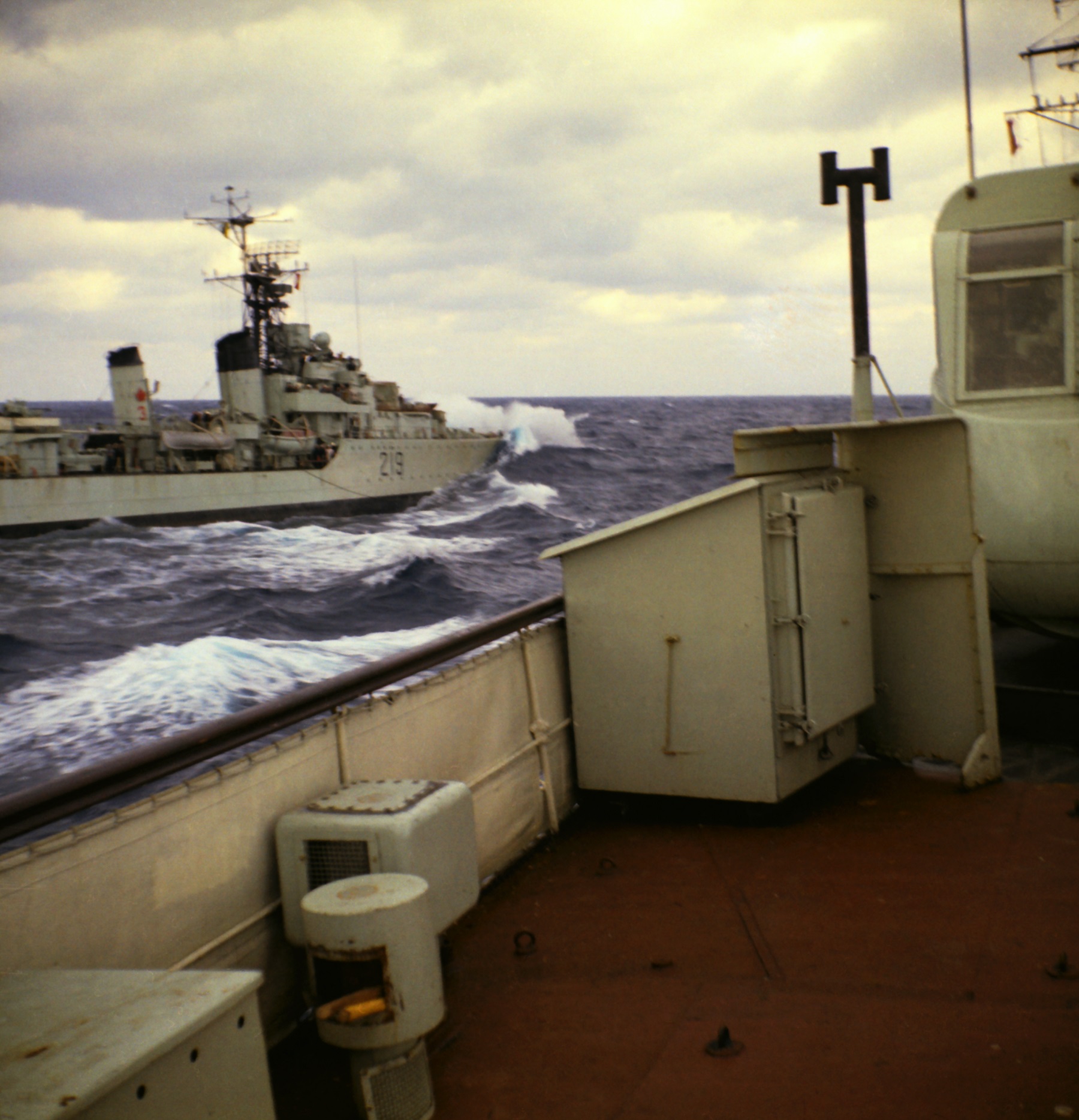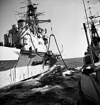 (CM16-CM18) HMCS IROQUOIS conducting a RAS with HMCS BONAVENTURE (CM18) RAS complete, IROQUOIS pulls away from BONAVENTURE