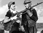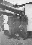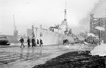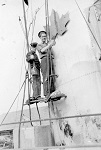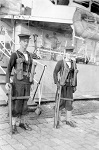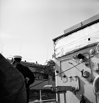 (RTL-LRB011) HMCS IROQUOIS' Maple Leaf on her funnel gets a fresh coat of paint in 1944 (RTL-LRB012) Two HMCS IROQUOIS sailors standing sentry with the Lanchester sub-machine gun, with 50 round magazines and long bayonets in 1945. Unknown location (RTL-LRB013) HMCS IROQUOIS'S whaler has been smashed to pieces in the davits during severe North Atlantic storm in early 1943 (RTL-LRB014) Unidentified RCN sailor onboard HMCS IROQUOIS. "The Some" written on back of photo (RTL-LRB015) HMS APOLLO, Manxman minelayer, carrying the Crown Prince Olav of Norway and the exiled Norwegian government, approaches HMCS IROQUOIS on 13 May 1945 in Oslo, Norway