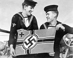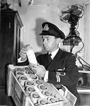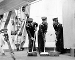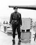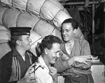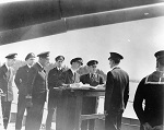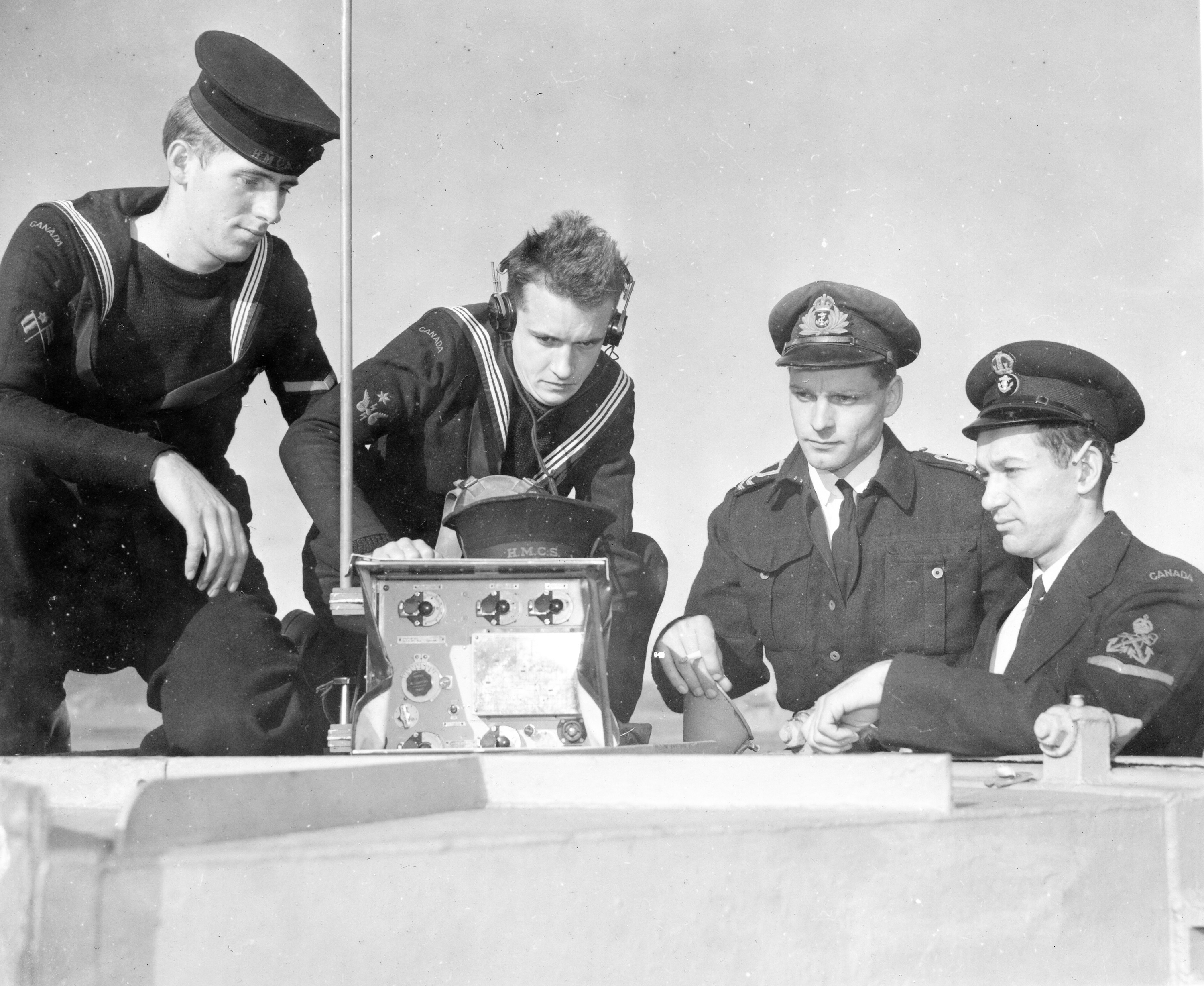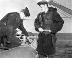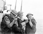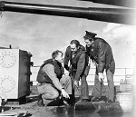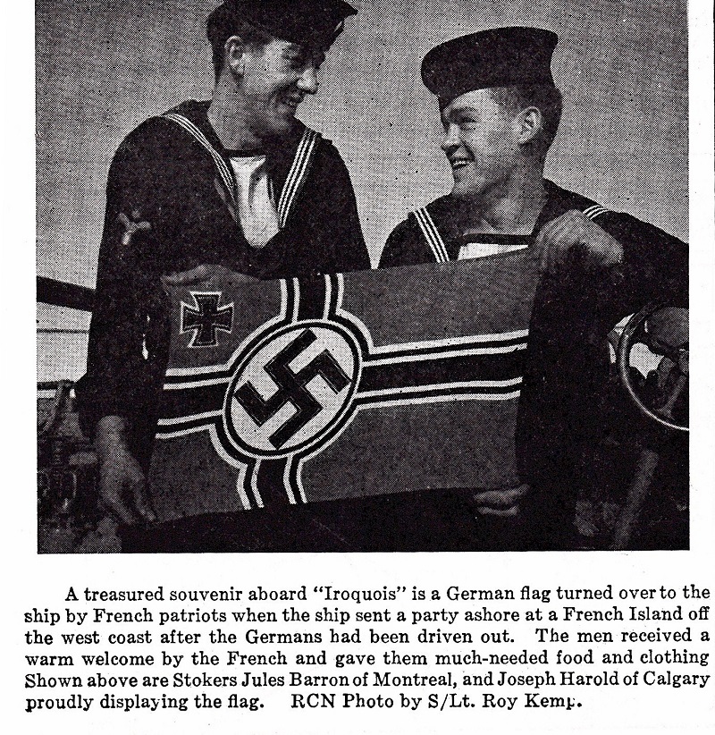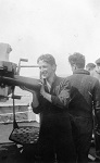 (RTL-LRB072) Unknown officer of the bridge of HMCS IROQUOIS (RTL-LRB073) Unknown Torpedo Cox'n on HMCS IROQUOIS (RTL-LRB074) Thomas Manson on HMCS IROQUOIS securing his mic for stowage (RTL-LRB075) Unknown sailors on HMCS IROQUOIS holding an Second World War German naval flag (RTL-LRB076) Unknown sailors on HMCS IROQUOIS holding a dummy wooden machine gun