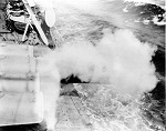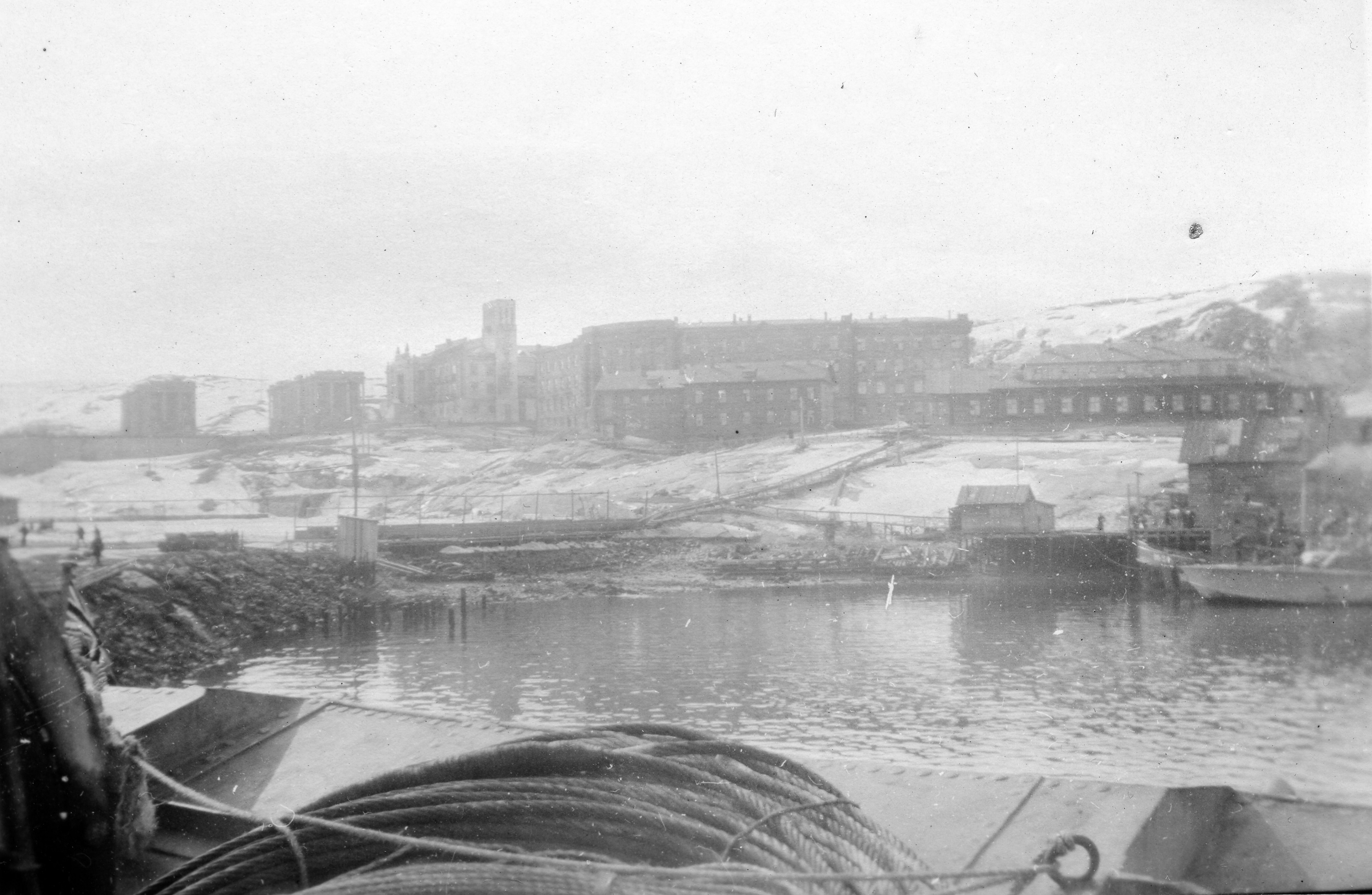 (RTL-LRB021) HMCS IROQUOIS making smoke and dropping depth charges (RTL-LRB022) HMCS IROQUOIS with HMShips MAURITIUS and URSA steaming at 32 knots and laying smoke screen to evade fire from shore batteries off the west coast of France on 22 August 1944. IROQUOIS and MAURITIUS had been straddled by shells from the Gironde Shore Battery (RTL-LRB023 / RTL-LRB-024) View of Polyarnoe, Russia from HMCS IROQUOIS during on of her stops while escorting Arctic convoys in late 1943 or early 1944 (RTL-LRB025) Gestapo Headquarters in Oslo, Norway in May 1945. Photo taken by RCN Sailor Lynford Bourne of HMCS IROQUOIS after the destroyer had escorted the exiled Norwegian Government to Oslo on 12 May 1945